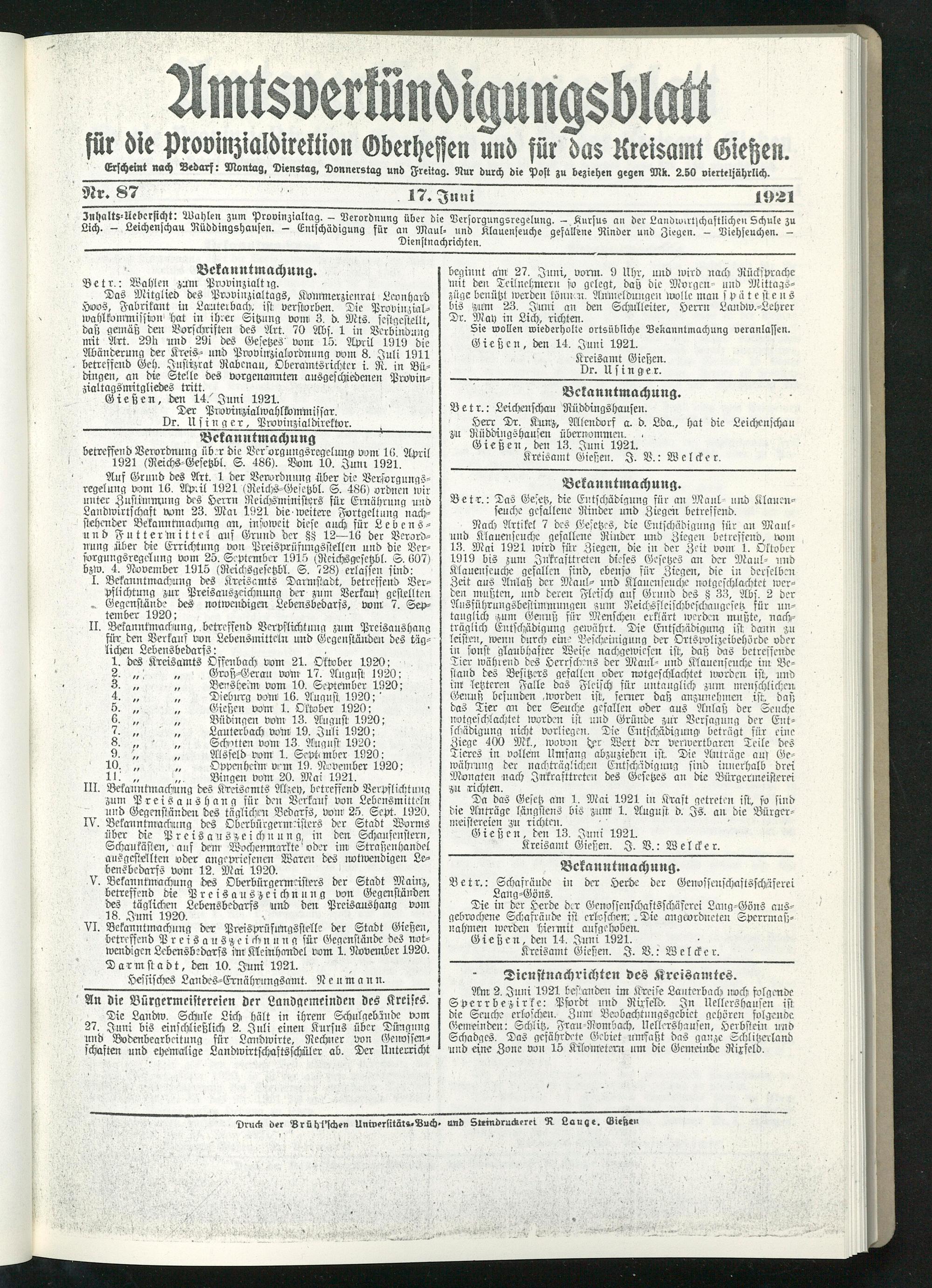 VI. Bekanntmachung der Preisprüfungsstelle der Stadt Gießen, -betreffend Preisauszeichnung für Gegenstände des notwendigen Lebensbedarfs im Kleinhandel vom 1. November 1920. Darmstadt, den 10. Juni 1921.