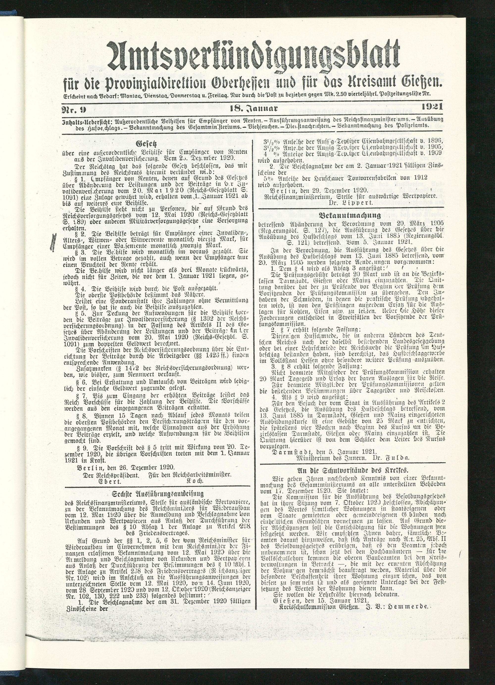 3nbaUs=Ucberfidit" Außerordentliche Beihilfen für Empfänger von Renten.-Anssührungsanweisung des Reichssinanzministernims.-Ausübung des Hufoechl'ags. - Bekanntmachung des Gefamtministeriums.- Viehseuchen. - Dienstnachrichten.-Bekanntmachung des Polizcmmts.