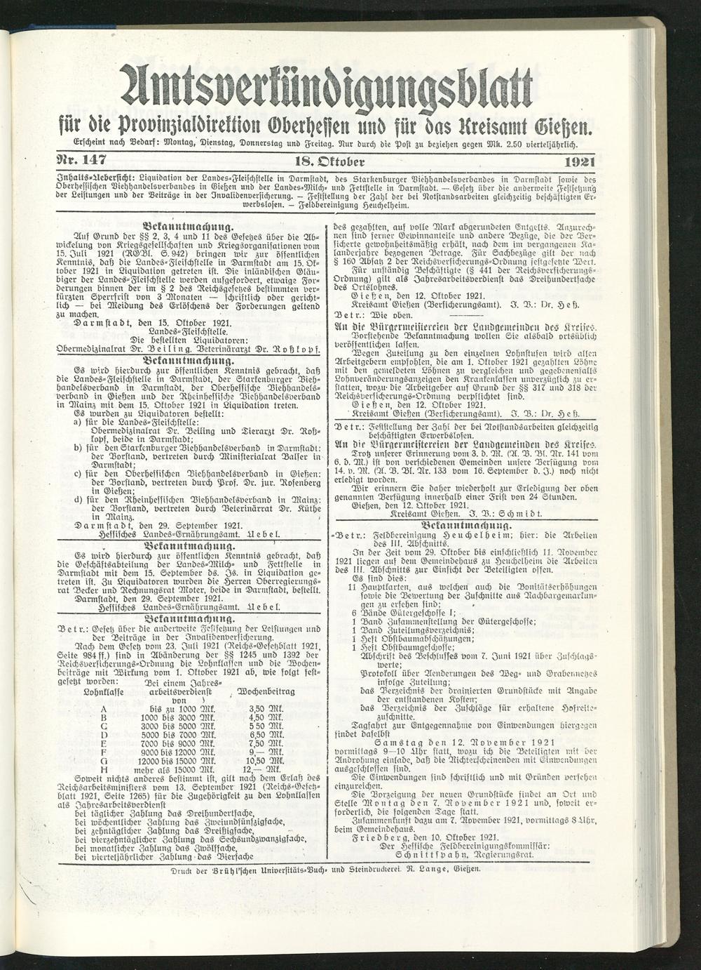 Jnhalts-Aebersicht: Liquidation der Landes-Fleischstelle in Darmstadt, des Starkenburger Viehhandelsverbandes in Darmstadt sowie des Oberhessischen Viehhandelsverbandes in Gießen und der Landes-Milch- und Fettstelle in Darmstadt. —. Gesetz über die anderweite Festsetzung der Leistungen und der Beiträge in der Invalidenversicherung. - Feststellung der Zahl der bei Notstandsarbeiten gleichzeitig beschäftigten Erwerbslosen. — Feldbereinigung Heuchelheim.