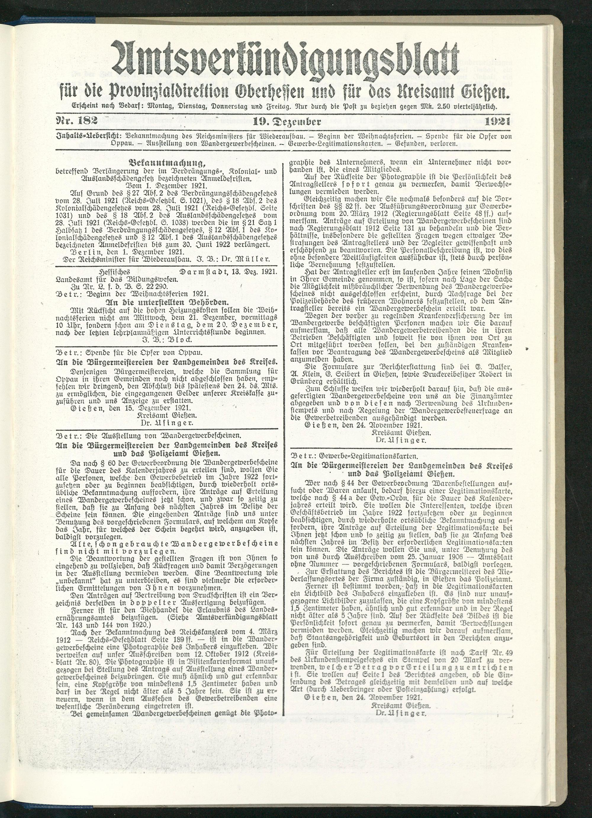 Jnhalts-Aederstcht: Bekanntmachung des Reichsministers für Wiederaufbau. — Beginn der Weihnachtsferien. — Spende für die Opfer von Oppau. — Ausstellung von Wandergewerbescheinen. — Gewerbe-Legitimationskarten. — Gefunden, verloren.