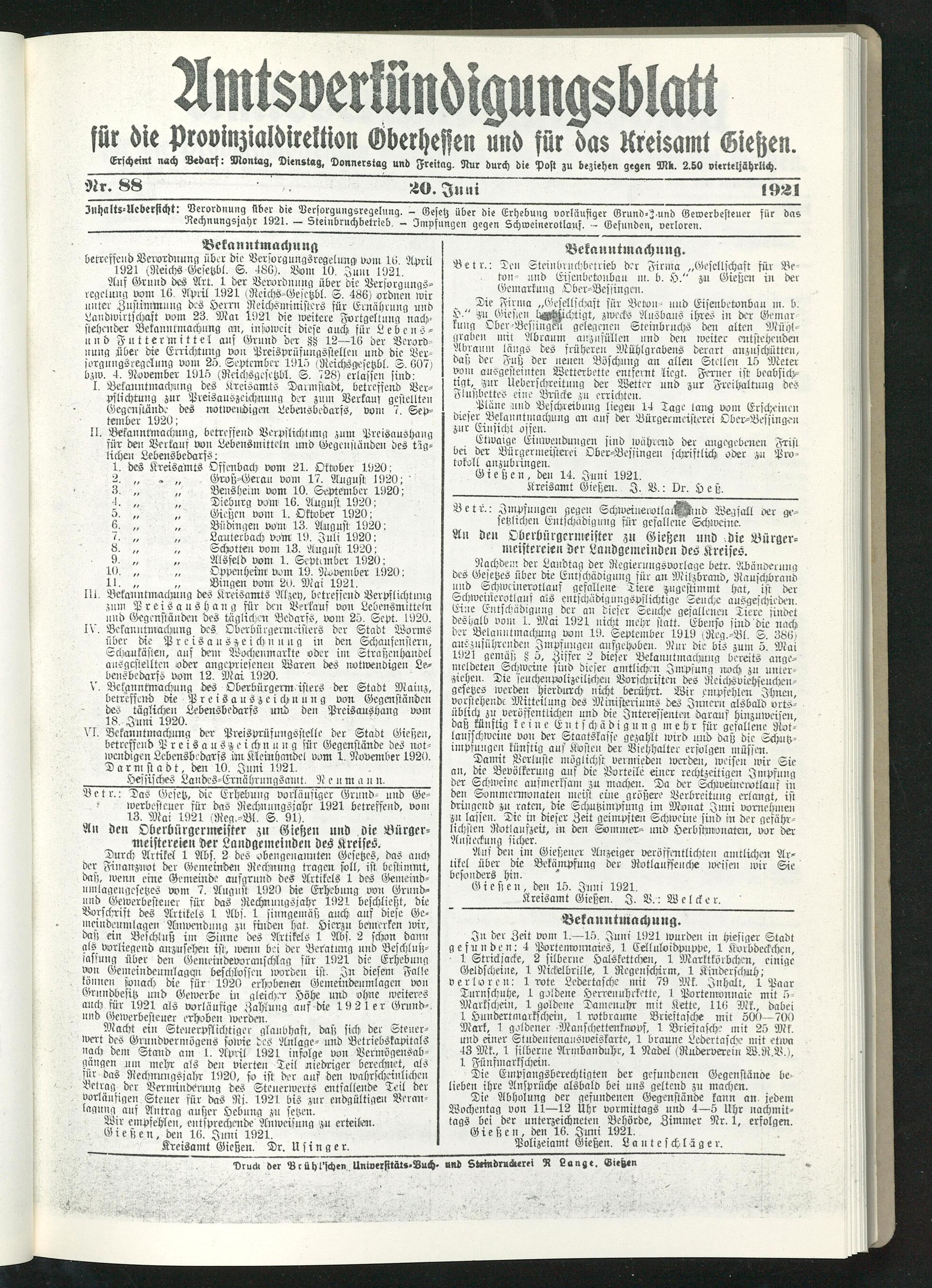 Jnhaltr-Uebecjicht. ®eroi'bnung flbev bie Dersorgungsregelung. - Besetz über die Erhebung vorläufiger Grund-^nmd Gewerbesteuer für das Rechnungsjahr 1921. Steinbruchbetrieb. — Impfungen gegen Schweinerotlauf. — Gefunden, verloren.