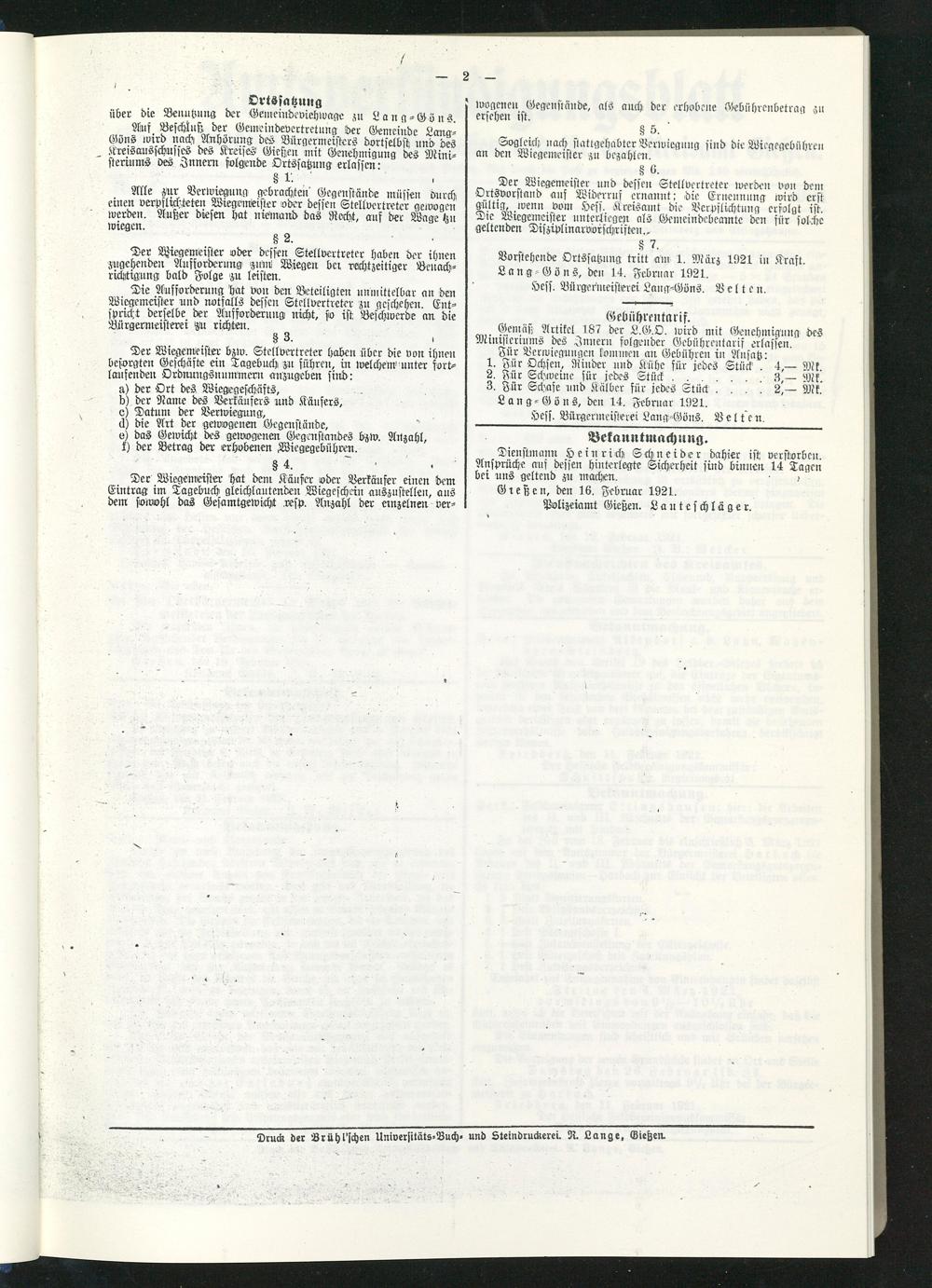 Vorstehende Ortssutzuug tritt am 1. März 1921 in Kraft. Lang Göns, den 14. Februar 1921.