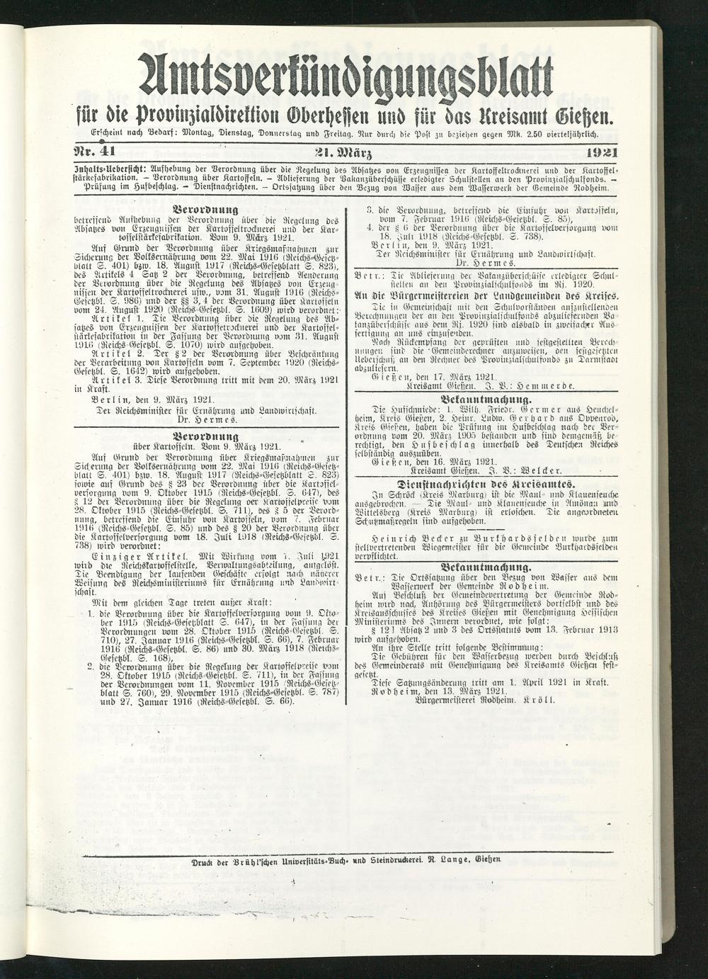 Znhalts-Ucberftcht: Aufhebung der Verordnung über die Regelung des Absatzes von Erzeugnissen der Kartoffeltrocknerei und der Kartoffel- stärtzefabriliation. — Verordnung über Kartoffeln. — Ablieferung der Valianzüberschüsse erledigter Lchulstellen an den Provinzialschulfonds. — Prüfung im Hufbeschlag. — Dienstnachrichten. — Ortssatzung über den Bezug von Wasser aus dem Wasserwerk der Gemeinde Rodheim.
