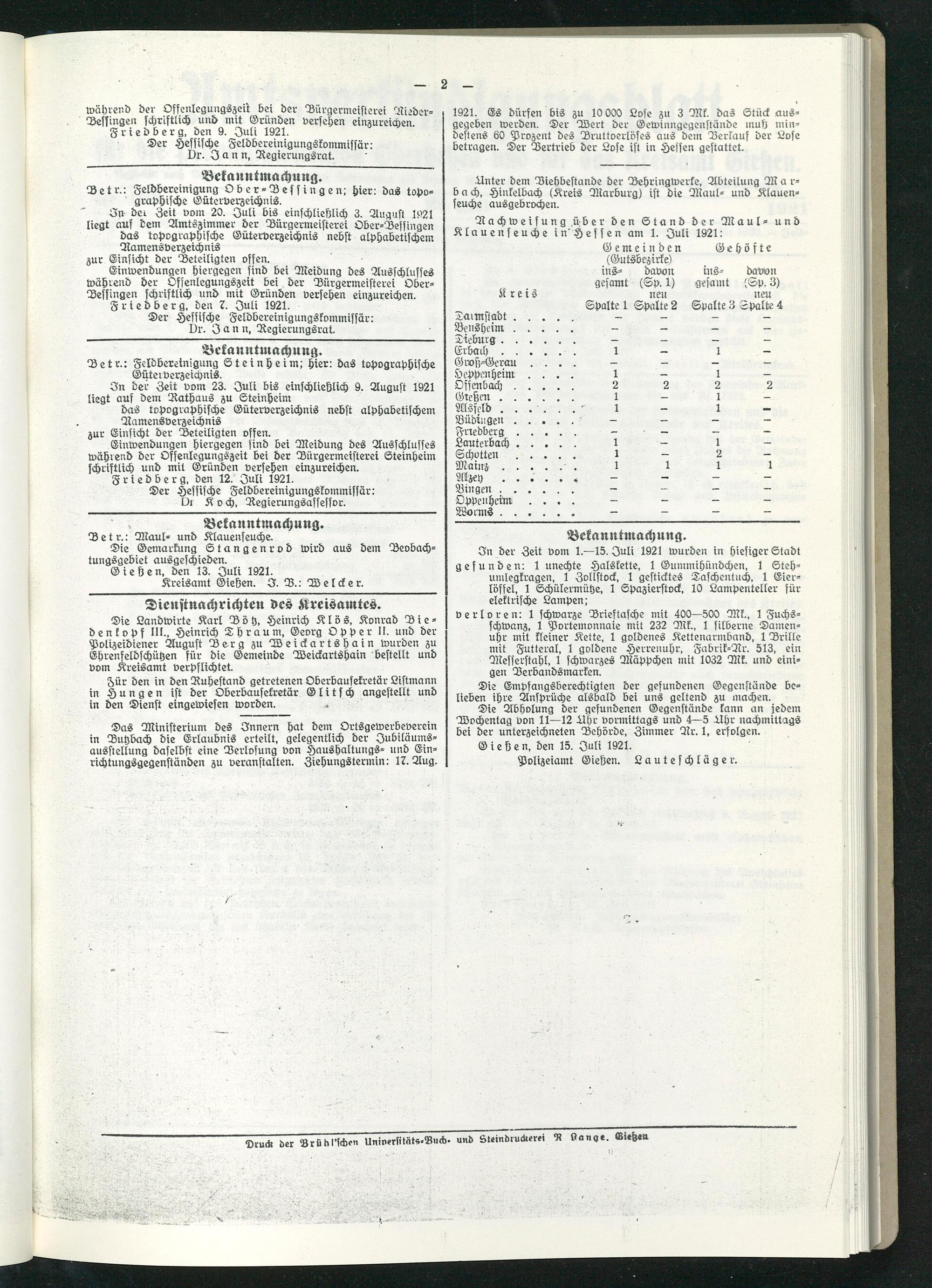 Iw der Zeit vom 20. Juli bis einschließlich 3. August 1921 liegt auf dem Amtszimmer der Bürgermeisterei Ober-Bessingen