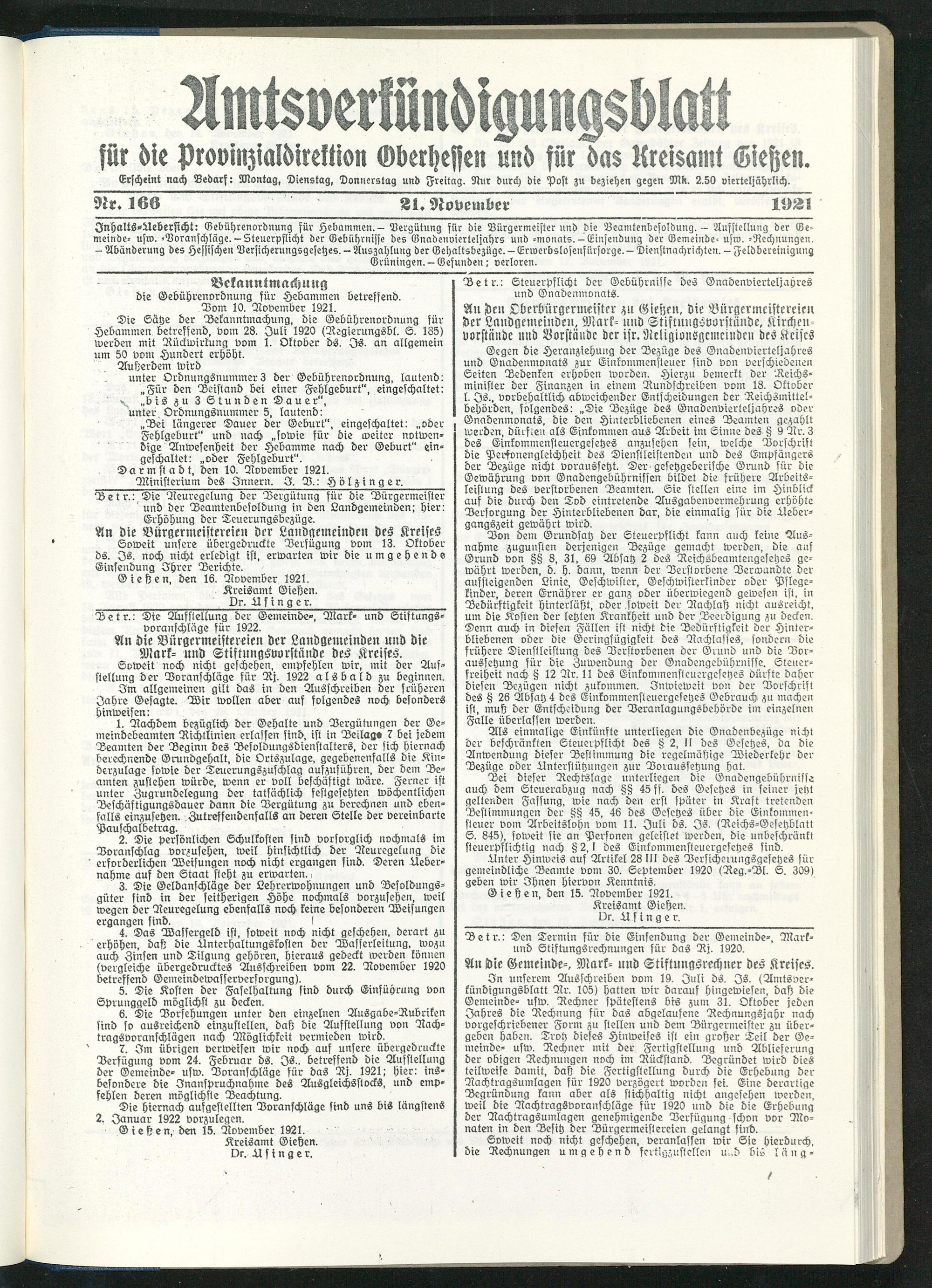 Jnhalts-Aebersicht: Gebührenordnung für Hebammen. - Vergütung für die Bürgermeister und die Beamtenbesoldung. - Aufstellung der Gemeinde- usw. -Voranschläge.-Lteuerpflicht der Gebührnisse des Bnadenvierteljahrs und -monats. —Einsendung der Gemeinde- usw. -Rechnungen. - Abänderung des Hessischen Versicherungsgesetzes.-Auszahlung der Gehaltsbczüge.-Erwerbslosenfürsorge. — Dienstnachrichten. - Feldbereinigung iörüningen.-Gefunden; verloren.