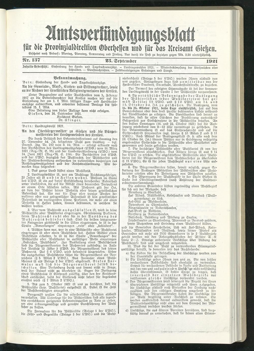 3ilt)cIts=Ucbcr(id!t. Einsendung der Hand- und Tagebuchsauszüge. — Landtagswahlen 1921. — Winterbekämpfung der Stechmücken oder Schnaken. — Dienstnachrichten. — Feldbereinigungen Erüningen und Langd.