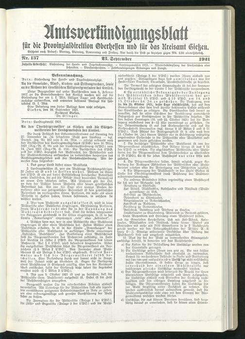 Friedelhausen zu Staufenberg, Winnerod zu Bersrod gehören, fowie Watzenborn und Steinberg einen Wahlbezirk bilden, und die Gemeinden Heuchelheim, Lich mit Hof-Albach, Kolnhausen, Mühlsachsen und Meilbach, sowie ferner Wieseck als Gemeinden mit mehr als 2500 Einwohnern in je 2 Wahlbezirke geteilt werden mit den Anfangsbuchstaben der Wähler A—K sowie L—Z. Etwaige anderweite Vorschläge über Bildung der Wahlbezirke sind uns umgehend mitzuteilen.