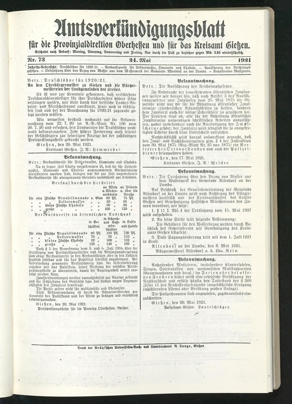 Znhalts-Ilebersicht: Druschlöhne für 1920 21. - Verkaufspreise für Selterswasser, Limonade und Chabeso. - Ausführung des Reichsimpfgesetzes. — Ortssatzung über den Bezug von Wasser aus dem Wasserwerk der Gemeinde Allendorf an der Lumda. — Anhaltendes Musizieren.