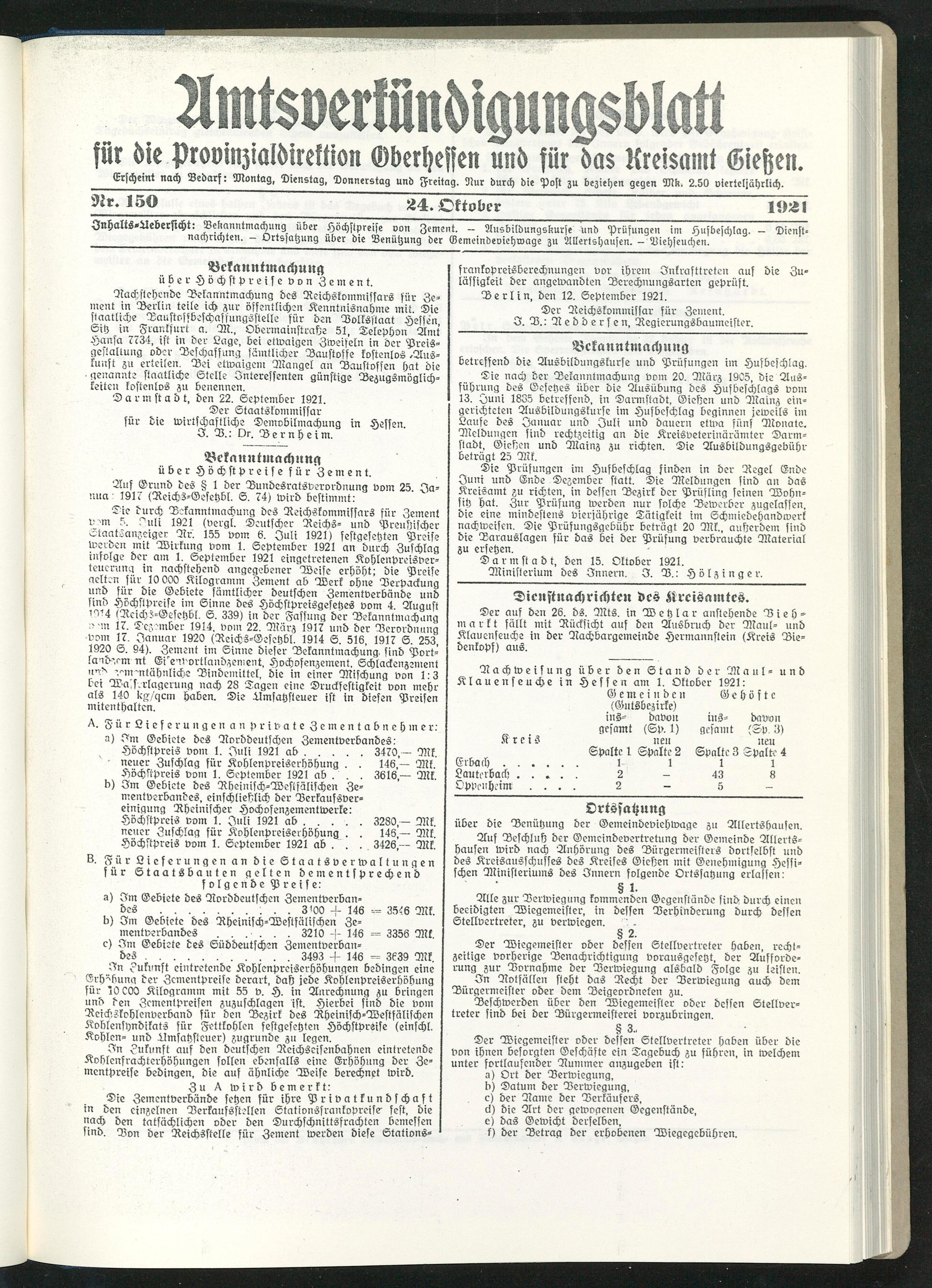 Jnhalis-Aebersicht: ®^<'nn^ma(^u,l9 über Höchstpreise von Zement. — Ausbildungskurse und Prüfungen im Husbeschlag. — Dienst- Nachrichten. - Ortsjatzung über die Benützung der Bemeindeviehwage zu Allertshausen. - Viehseuchen.
