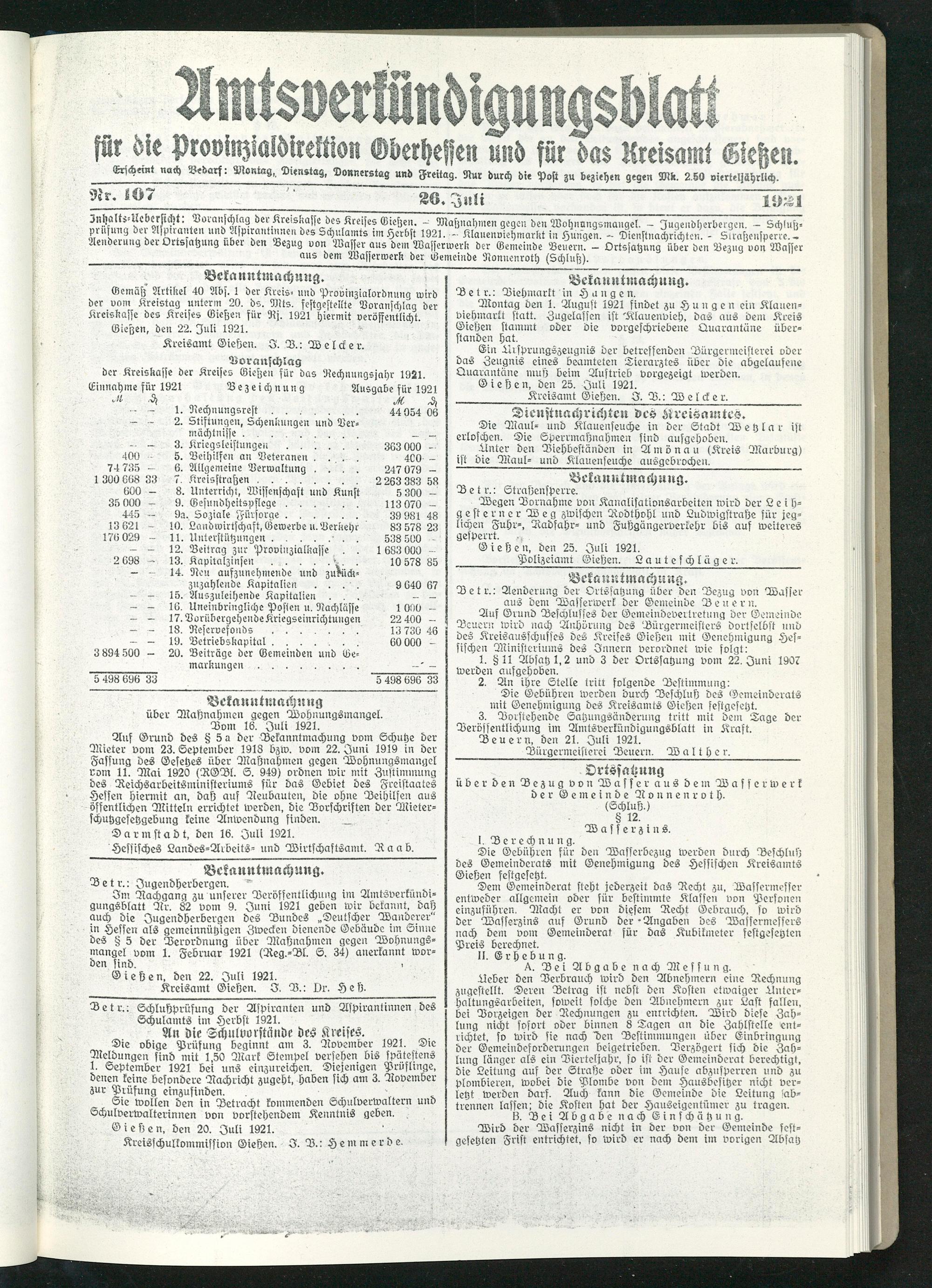 TÄ ■ dei Kreiskasse des Kretzes Liesten. - Mastnahmen gegen den Wohnungsmangel. - Jugendherbergen. - Sd)luß= nu K?, h n- nvtJ ^b , ’mT1 beS 5d),ma^ts "" H"bst 1921.- Klanenviehmarkt in Hungen. - Dienstnachrichten. - Straßensperre.-