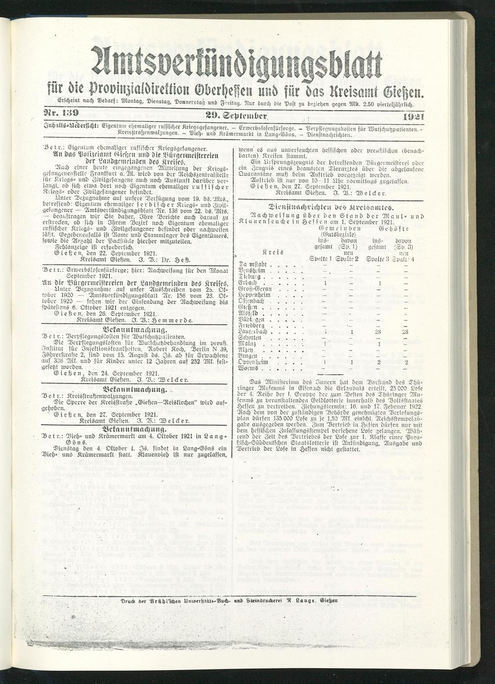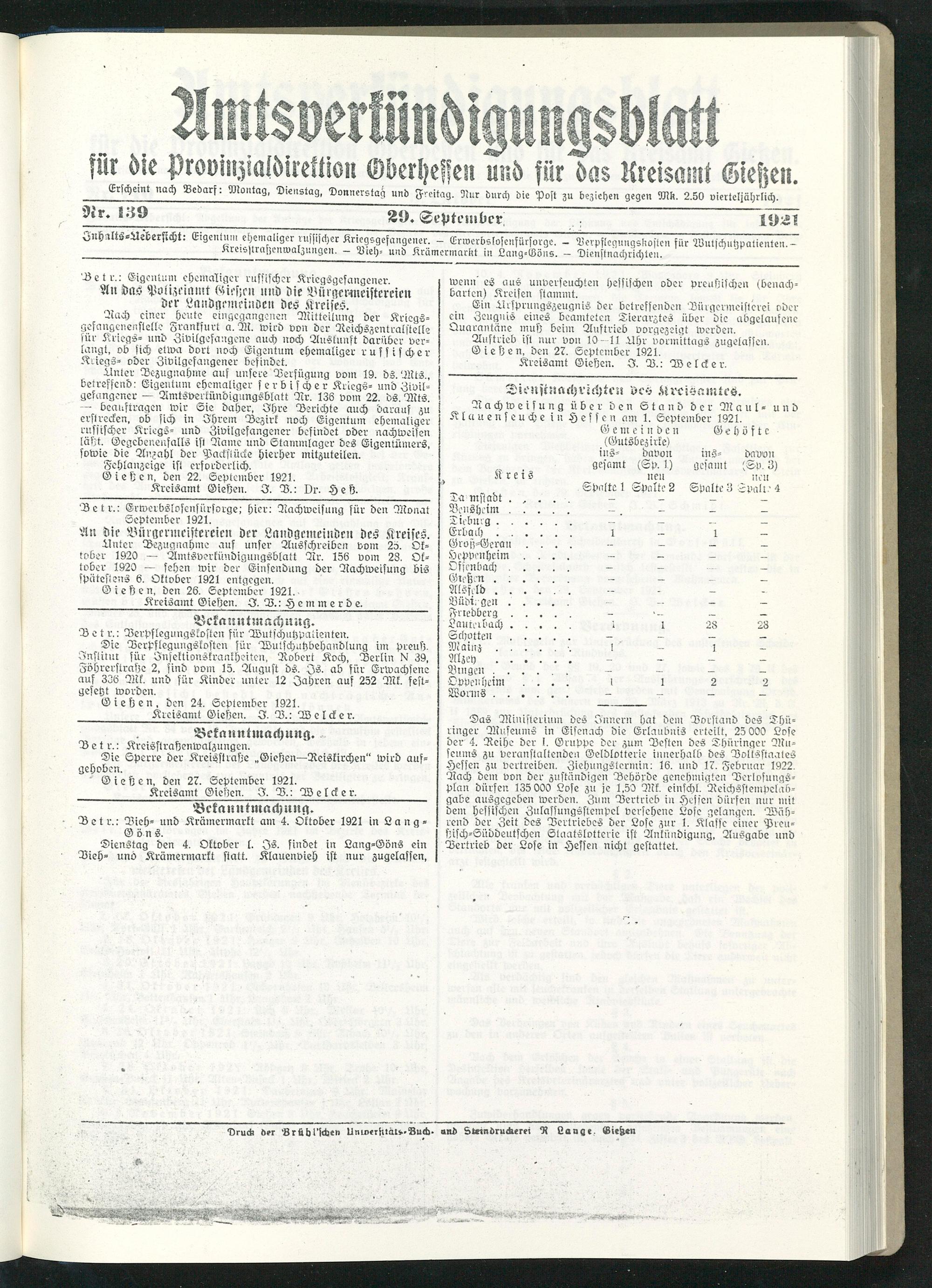 ZnhrltS-Uebersicht: Eigentum ehemaliger russischer Kriegsgefangener. - Lrwerbslosenfürsorge. - Verpflegungskostcn für 28utschutzpatienten.- Kreisst rasten malznngen. — Vieh- und Krämcrmarüt in Lang-Göns. — Dienstnachrichteii.
