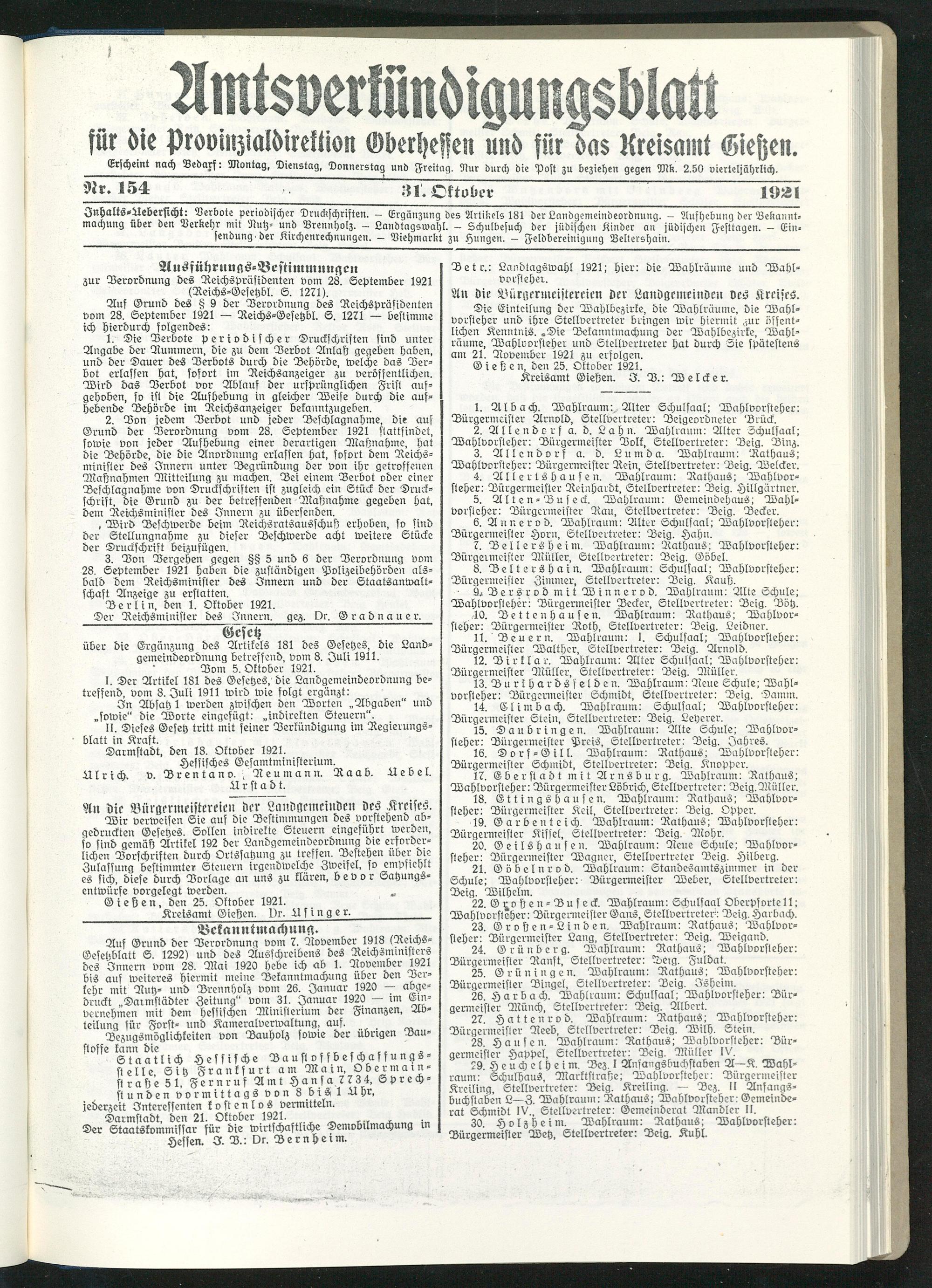 Jnhalts-Aebersicht: Verbote periodischer Druckschriften. — Ergänzung des Artikels 181 der Landgemeindeordnung. - Aufhebung der Bekanntmachung über den Verkehr mit Nutz- und Brennholz. — Landtagswahl. — Schulbesuch der jüdischen Kinder an jüdischen Festtagen. — Einsendung der Kirchenrechnungen. — Viehmarkt zu Hungen. — Feldbereinigung Beltershain.