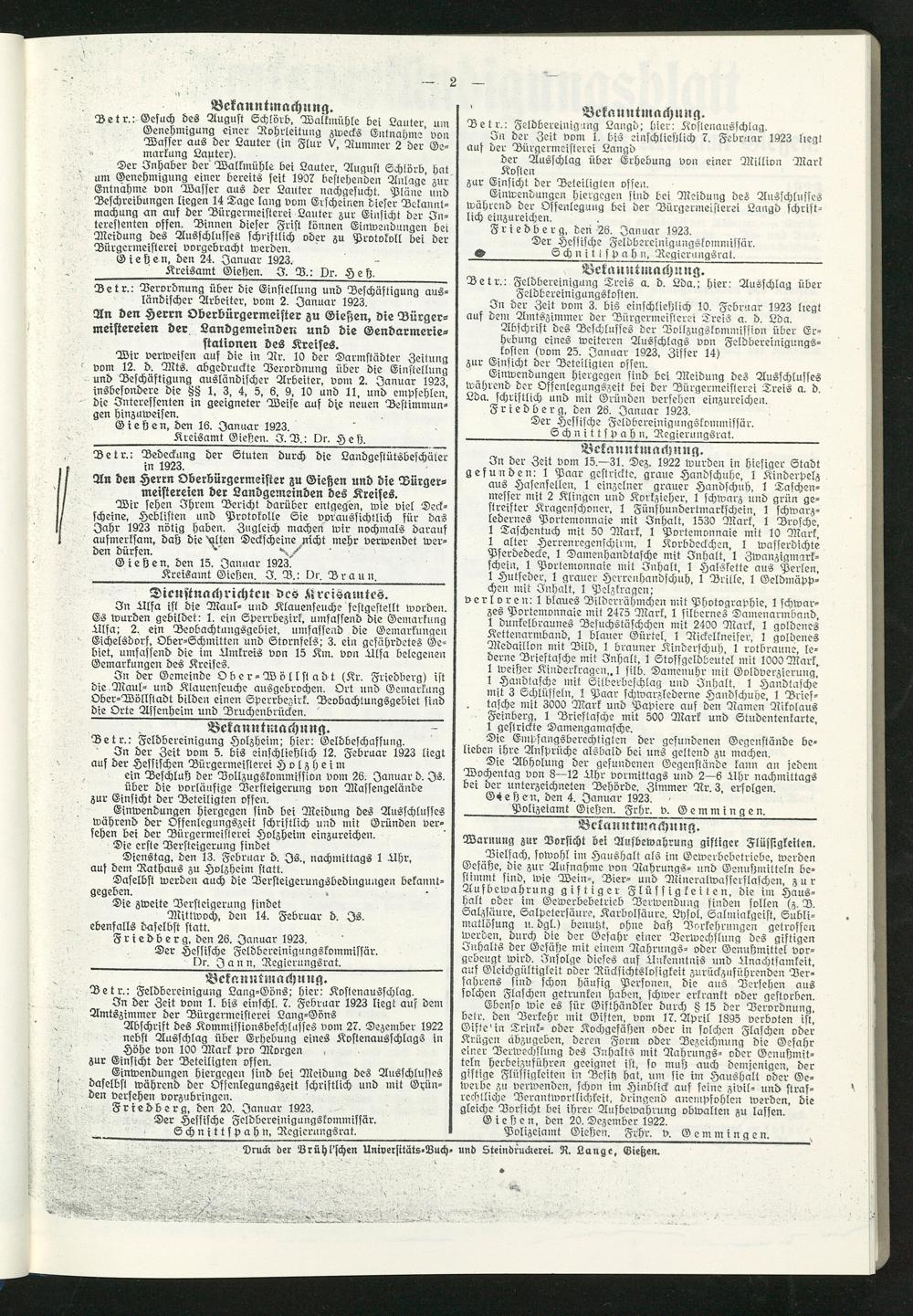 An der Zeit vom 5. bis einschließlich 12. Februar 1923 liegt auf der Hessischen Dürgermeislerei Holzheim