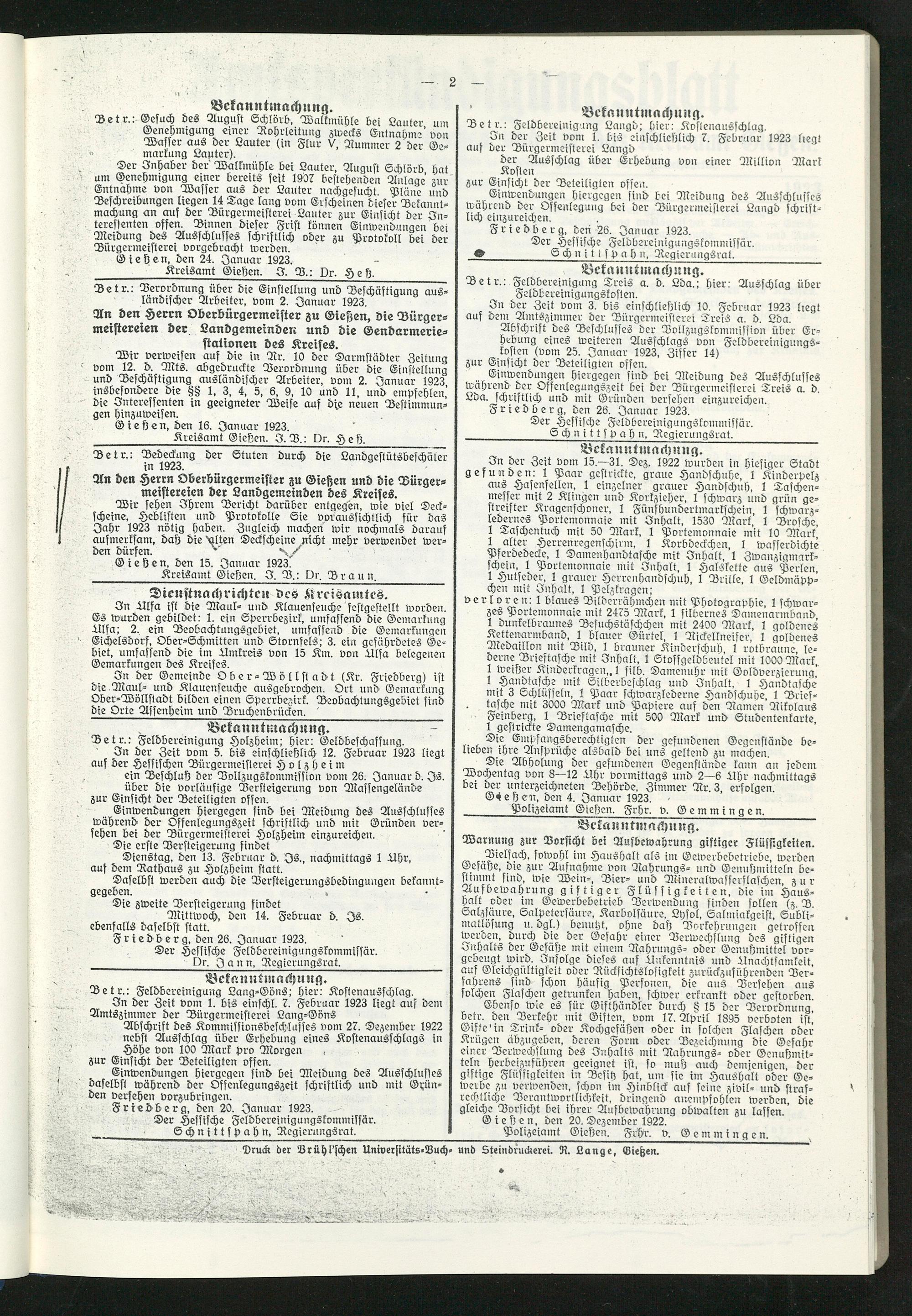In der Zeit vom 1. bis einschl. 7. Februar 1923 liegt auf den: Amtszimmer der Dürgernieisterei Lang-Göns