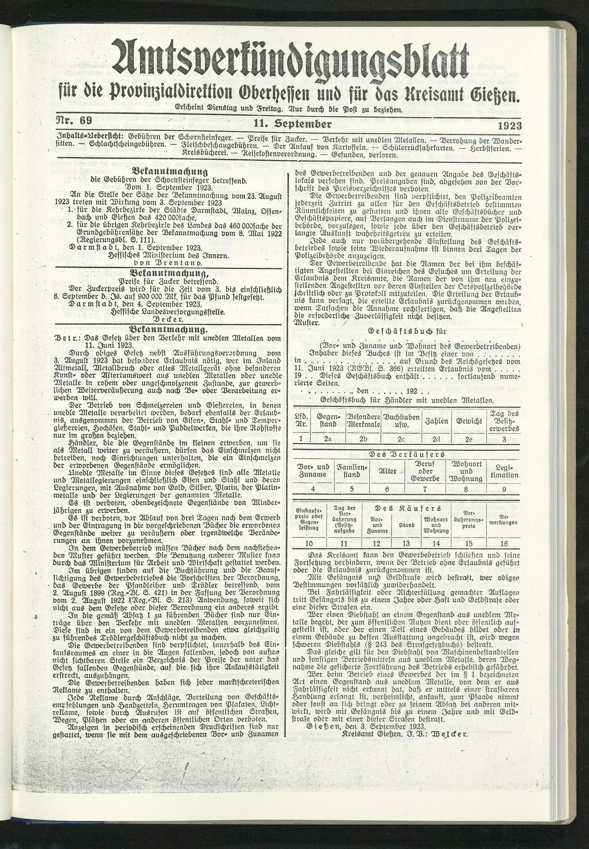 Durch obiges Gesetz nebst Ausführungsverordnung vom 3. August 1923 hat besondere Erlaubnis nötig, wer im Inland Altmetall, Metallbruch oder altes Metallgerät ohne besonderen Kunst- oder Altertumswert aus unedlen Metallen oder unedle Metalle in rohem oder ungeschmolzenem Zustande, zur geiverblichen Weiterveräusterung auch nach De- oder Verarbeitung erwerben will.