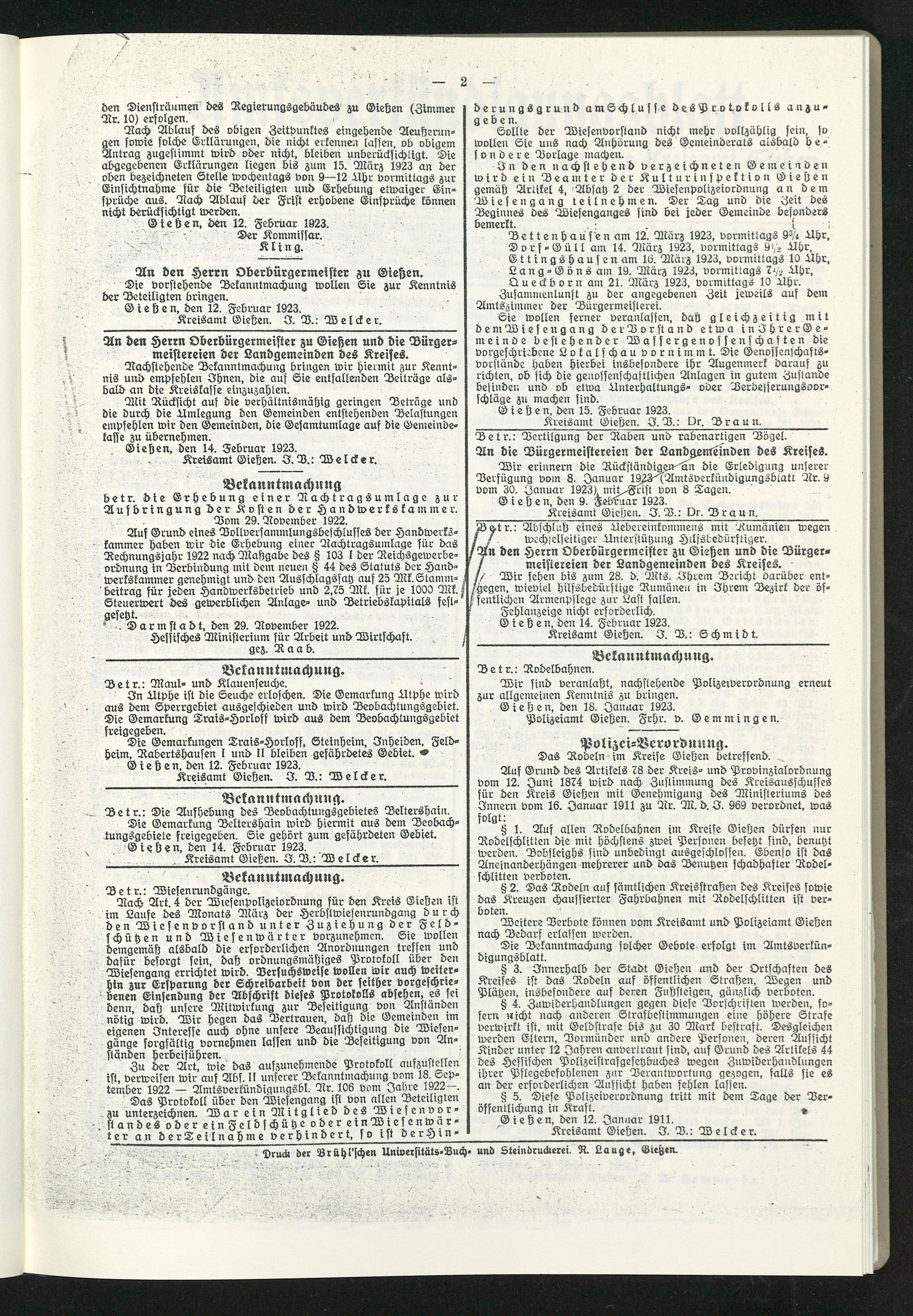 3 n den nachstehend verzeichneten Gemeinden wird ein Beamter der Kulturinspektion Gießen gemäß Artikel 4, "Absatz 2 der Wiesenpolizeiordnung an dem Wiesengang teilnehmen. Der Tag und die Zeit des Beginnes des Wiesenganges sind bei jeder Gemeinde besonders bemerkt. . : . ('S