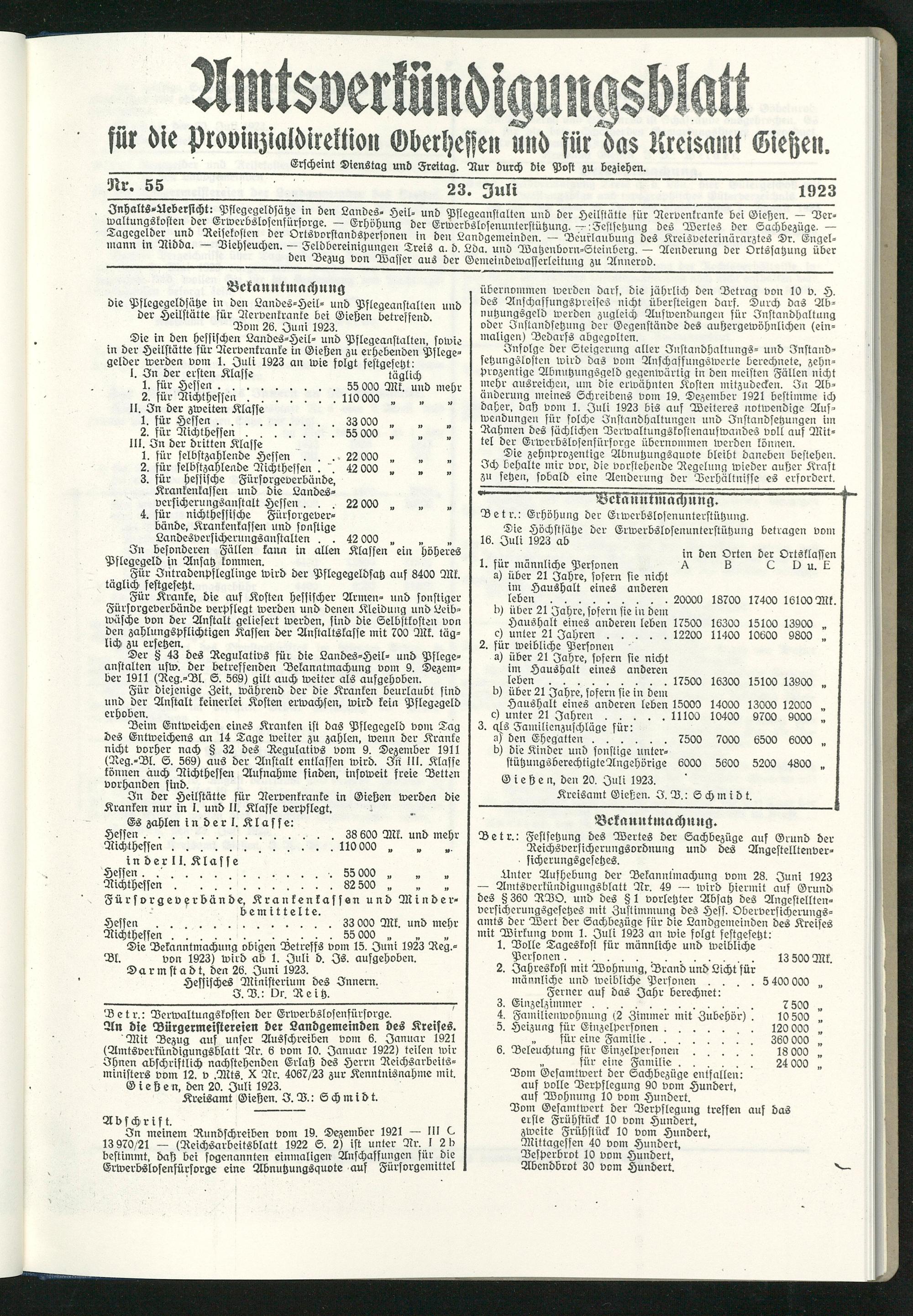 Unter Aufhebung der Bekanntmachung vom 28. Juni 1923 — Amtsverkündigungsblatt Nr. 49 — wird hiermit auf Grund des § 360 RBO. und des § 1 vorletzter Absatz des Angestelltenversicherungsgesetzes mit Zustimmung des Hess. Oberversicherungsamts der Wert der Sachbezüge für die Landgemeinden des Kreises mit Wirkung vom 1. Juli 1923 an wie folgt festgesetzt: