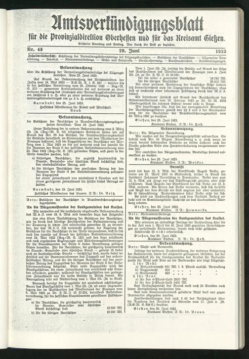 Znhalts-Aebersicht: Erhöhung der Verwaltungskostenbeiträge bei Tilgungsdarlehen. — Gebühren der Dauschätzer. — Allgemeine Bau- ordnung. Aermigt. Klemrentnerfuriorge. — Mehl- und Brotpreise. — Straßensperrung. — Dienstnachrichten. — Feldbereinigungen.