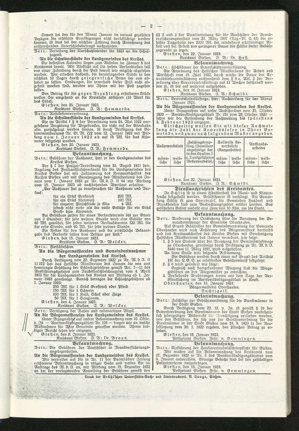 __Kreisamt Gießen. 3. V.: Schmidt.____________ Detr.: ErMerbslosenfürsorge; hier: Aachweisung für den Monat Januar 1923.
