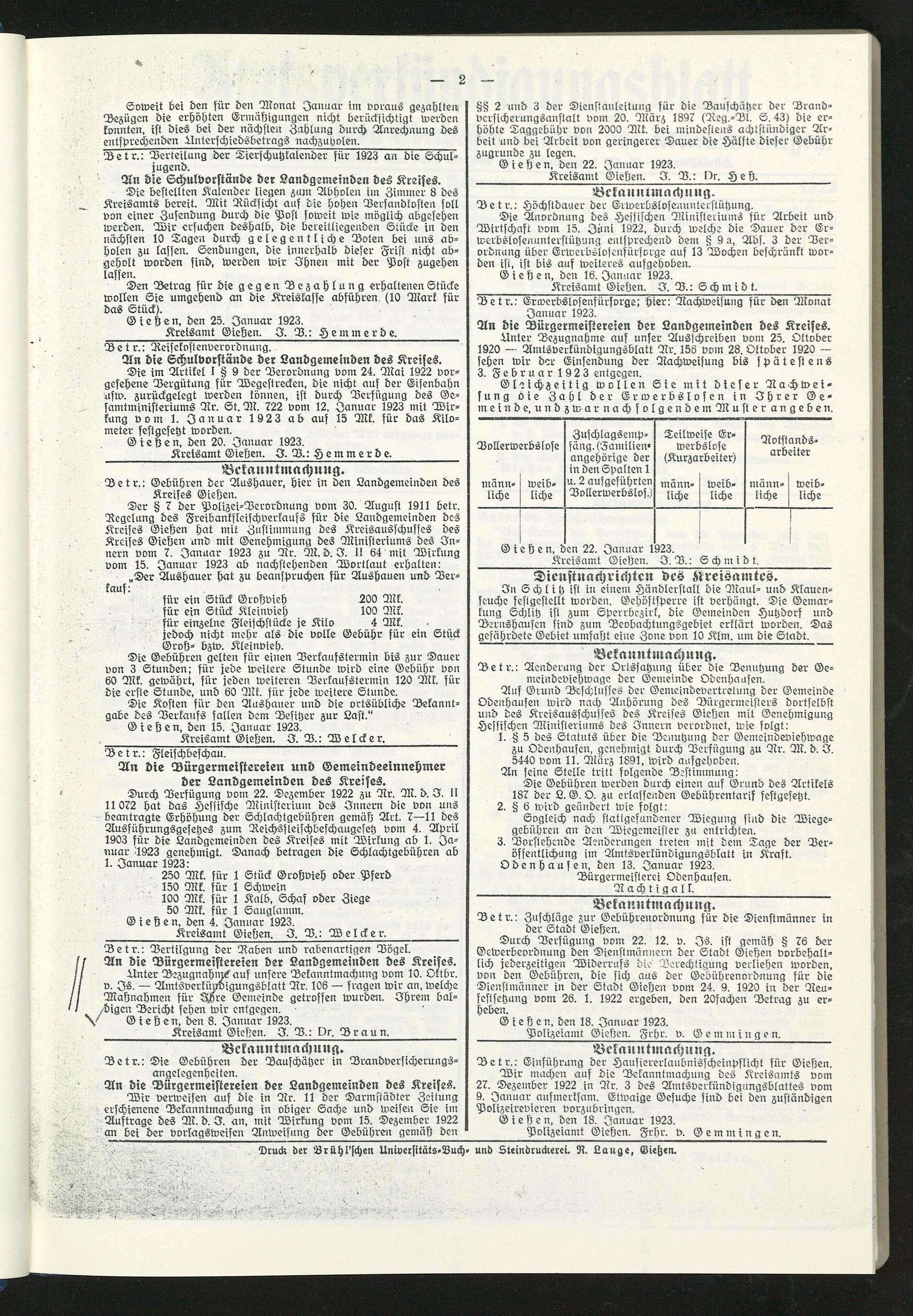 Durch Verfügung vom 22. Dezember 1922 zu Ar. M. d. 3. II 11072 hat das Hessische Ministerium des Innern die von uns Beantragte Erhöhung der Schlachtgebühren gemäß Art. 7—11 des Ausführungsgesetzes zum Reichsfleischbefchaugesetz vom 4. April 1903 für die Landgemeinden des Kreises mit Wirkung ab 1. Januar 1923 genehmigt. Danach betragen die Schlachtgebühren ab 1. Januar 1923: