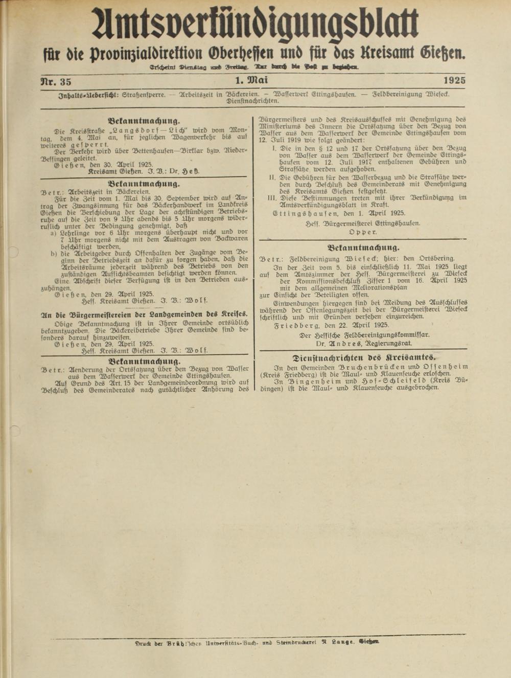 InhaltS-Uebersicht: Strassensperre. Arbeitszeit in Bäckereien. - Wasserwerk Ettingshausen. — Feldbereinigung Wieseck.