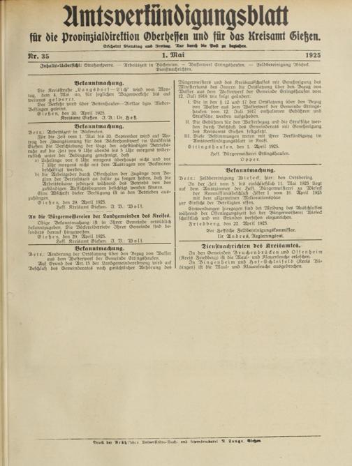 3n der Zeit vom 5. bis einschliesslich 11. Mai 1925 liegt auf dem Amtszimmer der Hess. Bürgermeisterei zu Wieseck der Kommissionsbeschluss Ziffer 1 vom 16. April 1925 mit dem allgemeinen Meliorationsplan