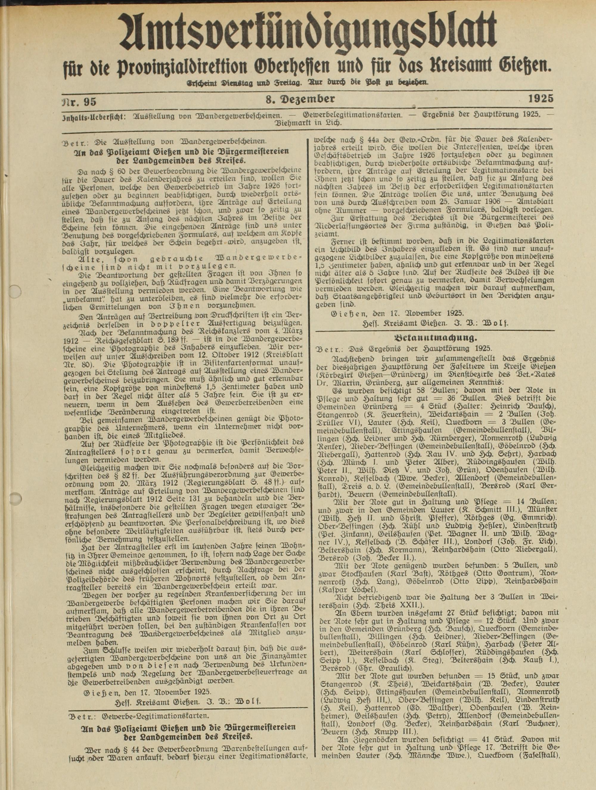An das Polizeiamt Gießen und die Bürgermeistereien der Landgemeinden des Kreises.