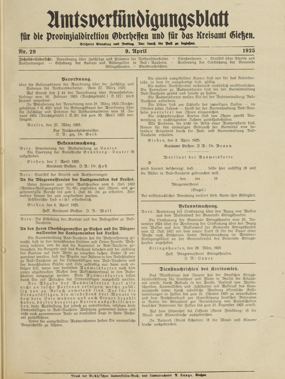InhaltS-Hcbersicht: Verordnung über Zuschläge und Prämien für Aotstandsarbeiter. - Strahensperre. - Statistik über Streiks und Aussperrungen — Erhebung der Kurtaxe und Bädergelder in Bad - Nauheim. - Aenderung der Ortssatzung der Gemeinde Ettingshausen. - Dienstnachrichten.