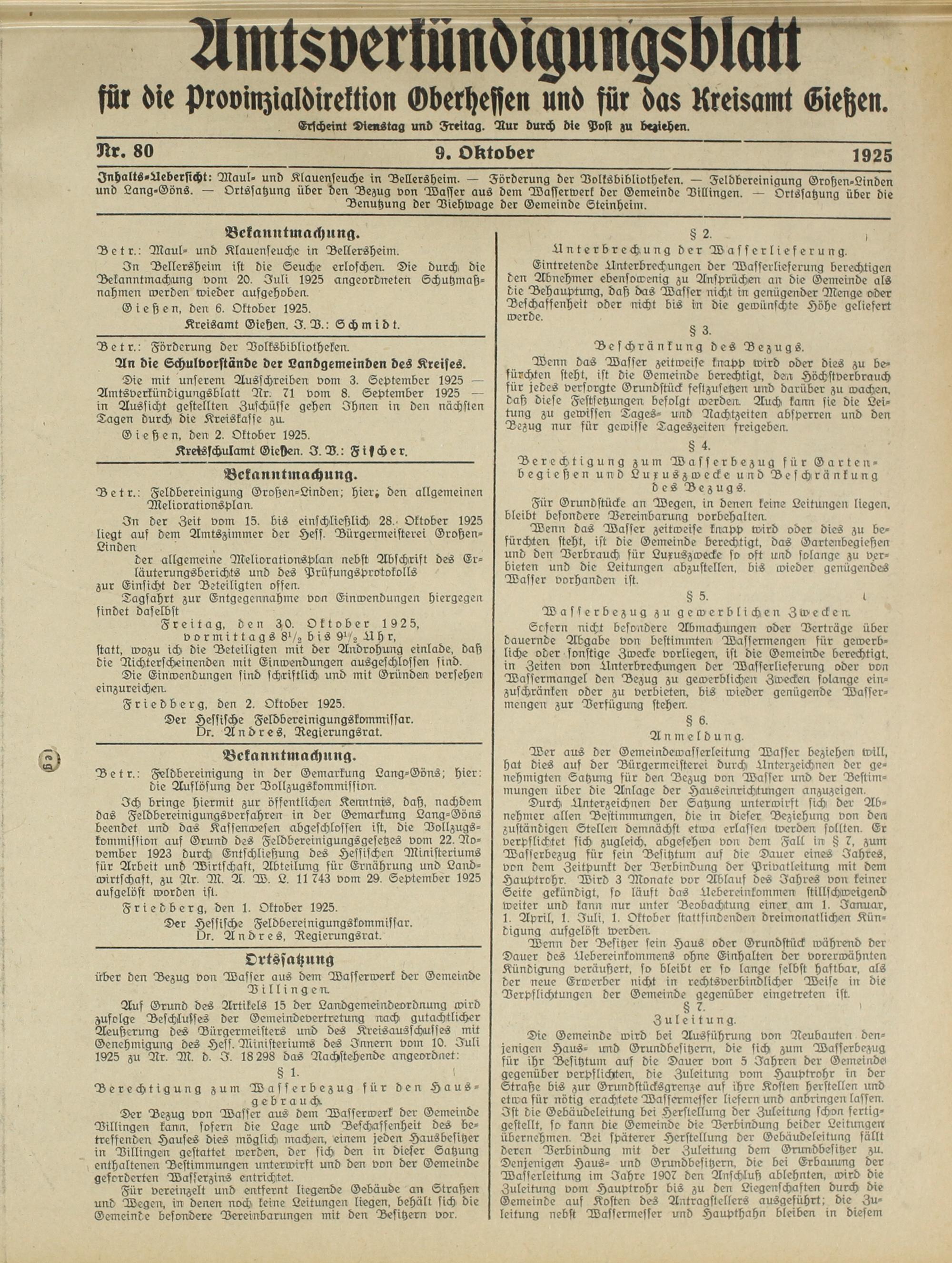 Fnhalts-Aeberstcht: Maul- und Klauenseuche in Bellersheim. — Förderung der Volksbibliotheken. — Feldbereinigung Grohen-Linden und Lang-Göns. — Ortssahung über den Bezug von Master aus dem Wasserwerk der Gemeinde Dillingen. - Ortssahung über die Benutzung der Biehwage der Gemeinde Steinheini.