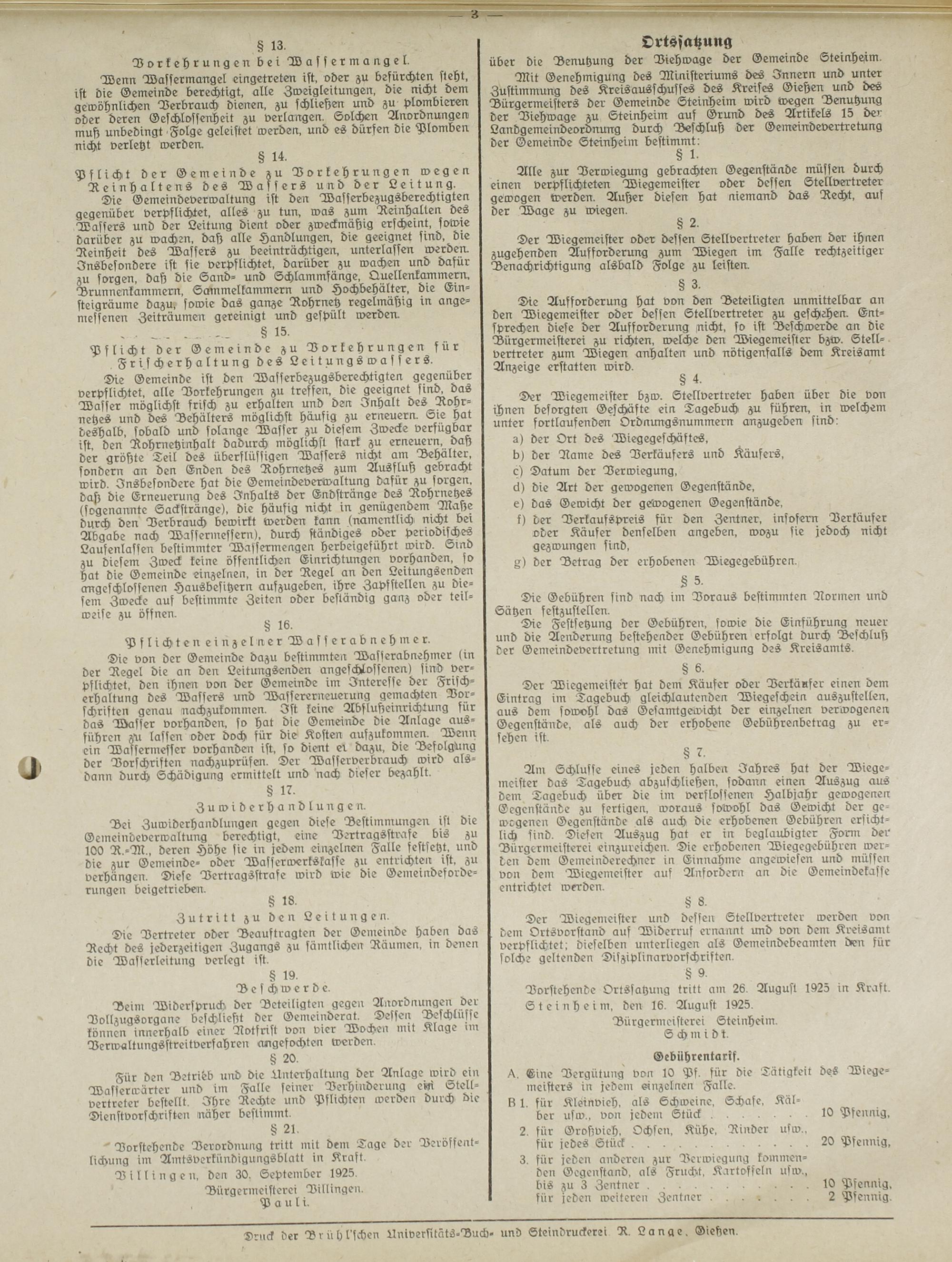 Mit Genehmigung des Ministeriums des Innern und unter Zustimmung des Kreisausschusses des Kreises Gießen und des Bürgermeisters der Gemeinde Steinheim wird wegen Benutzung der Viehwage zu Steinheim auf Grund des Artikels 15 der Landgemeindeordnung durch Beschluß der Gemeindevertretung der Gemeinde Steinheim bestimmt: