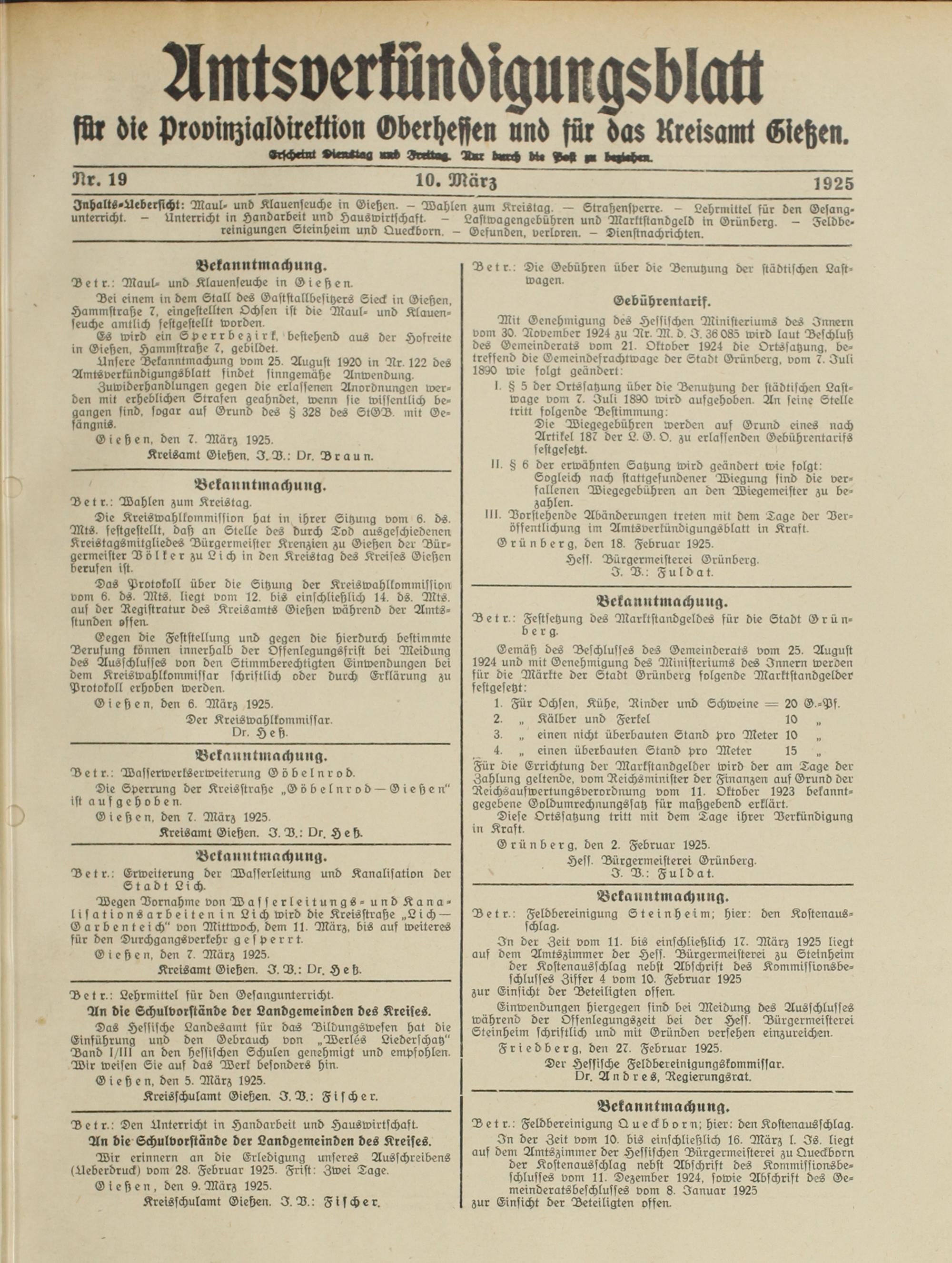 Inhalts-Aebersicht: Maul- und Klauenseuche in Gießen. - Wahlen zum Kreistag. - Straßensperre. - Lehrmittel für den Gesang- unterricht. - Unterricht in Handarbeit und Hauswirtschaft. - Lastwagengebühren und Marktstandgeld in Grünberg. - Feldbe- reinigungen Sleinyeim und Queclborn. — Gefunden, verloren. — Dienstnachrichten.