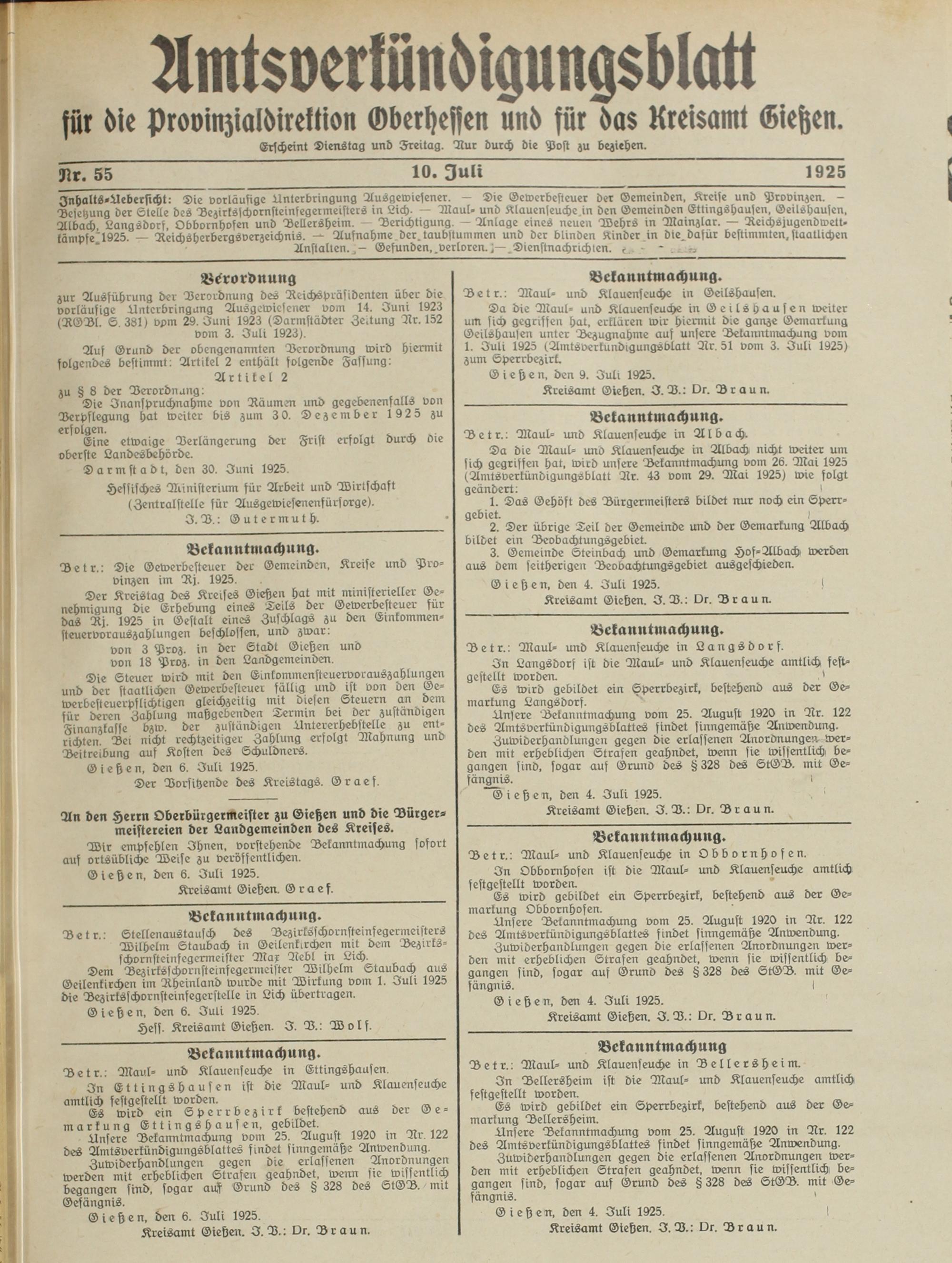 Znhalts-Uebersicht: Die vorläufige Unterbringung Ausgewiesener. - Die Gewerbesteuer der Gemeinden, Kreise und Provinzen. - Besetzung der Stelle des Bezirksschornsteinfegermeisters in Lich. - Maul- und Klauenseuche in den Gemeinden Ettingshausen, Geilshausen, Albach, Langsdorf, Obbornhofen und Bellersheim. - Berichtigung. - Anlage eines neuen Wehrs in Mainzlar. — Reichsjugendwett. kämpfe'1925. - Reichsherbergsverzeichnis. — Aufnahme der.taubstummen und der blinden Kinder in die.dafür bestimmten,staatlichen Anstalten.,- Gefunden,.verloren.^—.Dienstnachrichlen. f