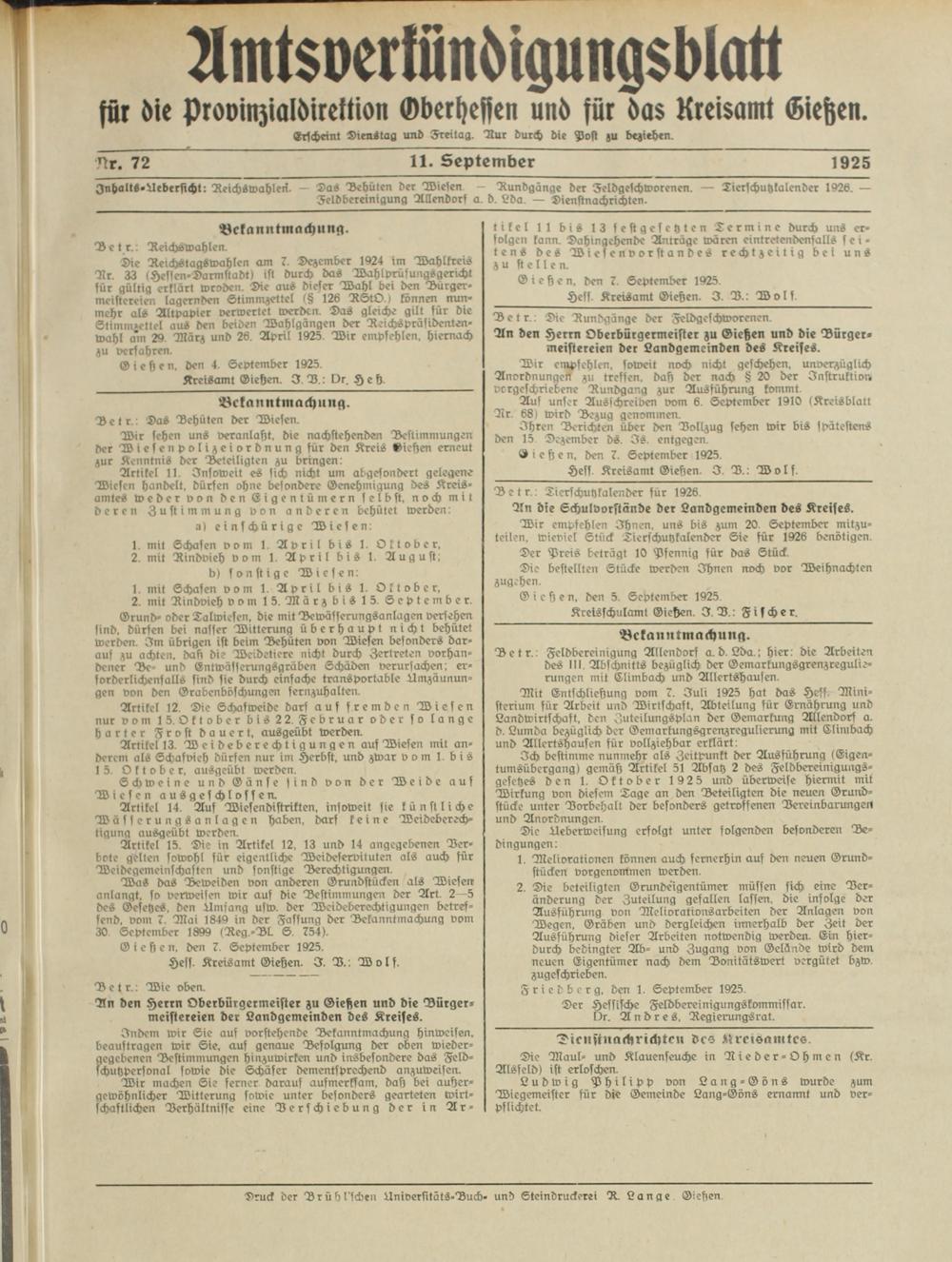 InhaltS-Aeberficht: Reichswahlen - Das Behüten der Wielen -- Bundgänge der Feldgeschworenen. — Tierschutzkalender 1926. — Feldbereintgung Allendorf a. d. Lda. — Dienstnachrichten.