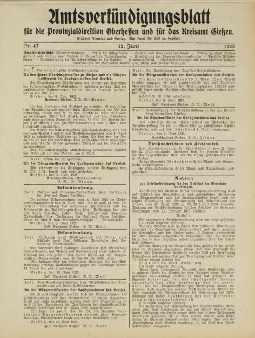 InhaltS-Ueberstcht: Fleischuntersuchung - Schuh der Pflegekinder. Saison- und Inventurausverkäufe. - Verlegung eine» Vaster- grabens und Anlage einer Schleuse in Gemarkung Rabertshausen. - Verpflichtung der Feuerwehrkommandanten. - Duplikat-Arbeits- bücher. Aushändigung der Acichsverlastung an die Schüler. Dienstnachrichten. - Friedhossordnungen mit entsprechenden Polizeiverordnungen der Gemeinden Daubringen, Utphe und Aieder-Bessingen.