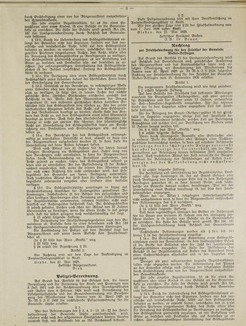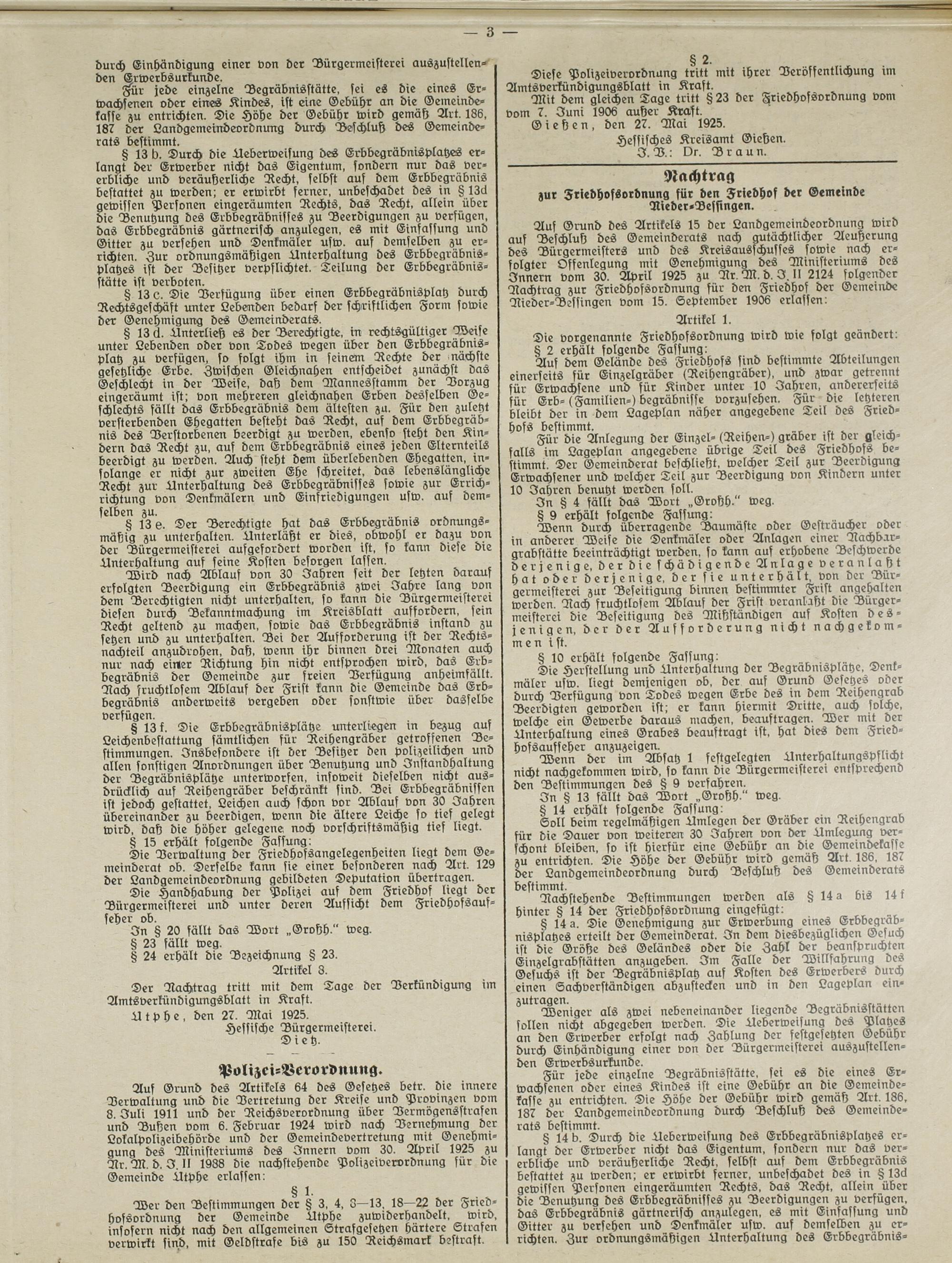 Auf Grund des Artikels 15 der Landgemeindeordnung wird auf Beschluß des Gemeinderats nach gutächtlicher Aeußerung des Bürgermeisters und des Kreisausschusses sowie nach erfolgter Offenlegung mit Genehmigung des Ministeriums des Innern vom 30. April 1925 zu Rr. M. d. I.Il 2124 folgender Rachtrag zur Friedhofsordnung für den Friedhof der Gemeinde Rieder-Bessingen vom 15. September 1906 erlassen: