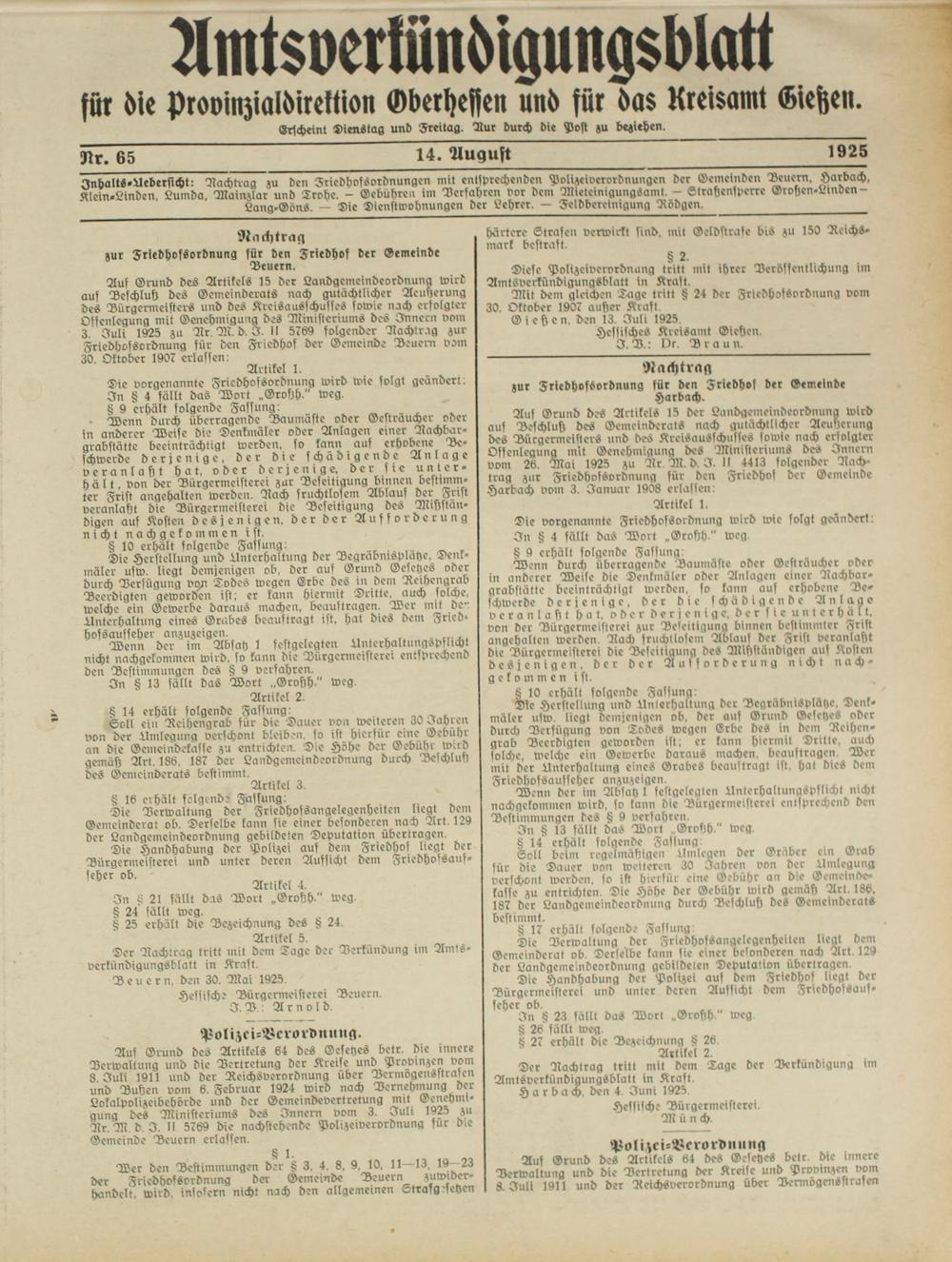 InhaltS-Uebersicht: Aachtrag zu den FriedbofSordnungcn mit entsprechenden Polizeiverordnungen der Gemeinden Beuern. Harbach, Klein-Linden Lumda Mainzlar und Trohe. - Gebühren im Verfahren vor dem MieteinigungSamt. - Straßensperre Großen-Linoen- Lang-Göns — Die Dienstwohnungen der Lehrer. — Feldbereinigung Rödgen.