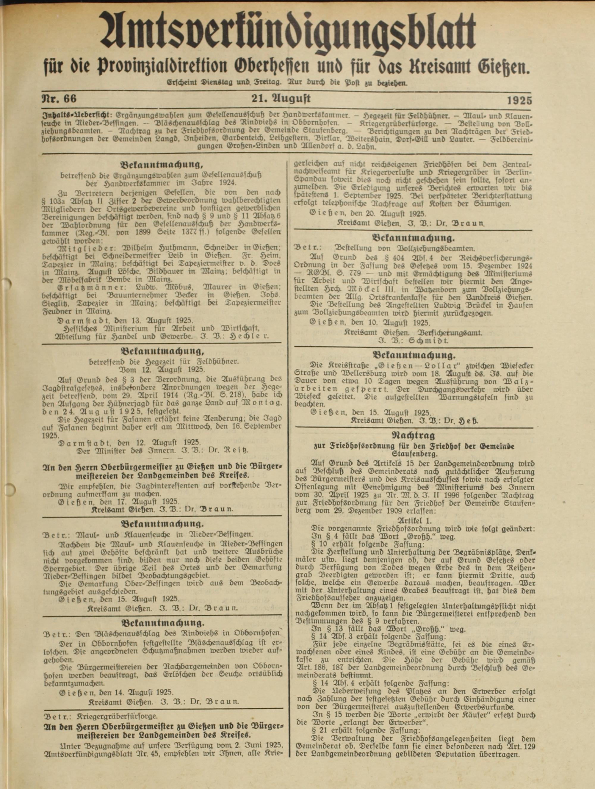 Inhalts-Ueberstcht: Ergänzungswahlen zum Gesellenausschuh der Handwerkskammer. - Hegezeit für Feldhühner. - Maul-und Klaucn- seuche in Dieder-Befstngen. — Dläschenausschlag des Dindviehs in Obbornhofen. - Kriegergrübersürsorgc — Bestehung von Voll- ziehungSbeamten. - Dachtrag zu der FriedhofSordnung der Gemeinde Staufenberg. — Derichtigungcn zu den Dachträgcn der Fried- hofSordnungen der Gemeinden Langd. Inheiden, Garbenteich, Leihgestern. Birklar, WeiterShain, Dorf-Gill und Lauter. — Feldbercini- gungen Grvhen-Linden und Dllendorf a. d. Lahn.
