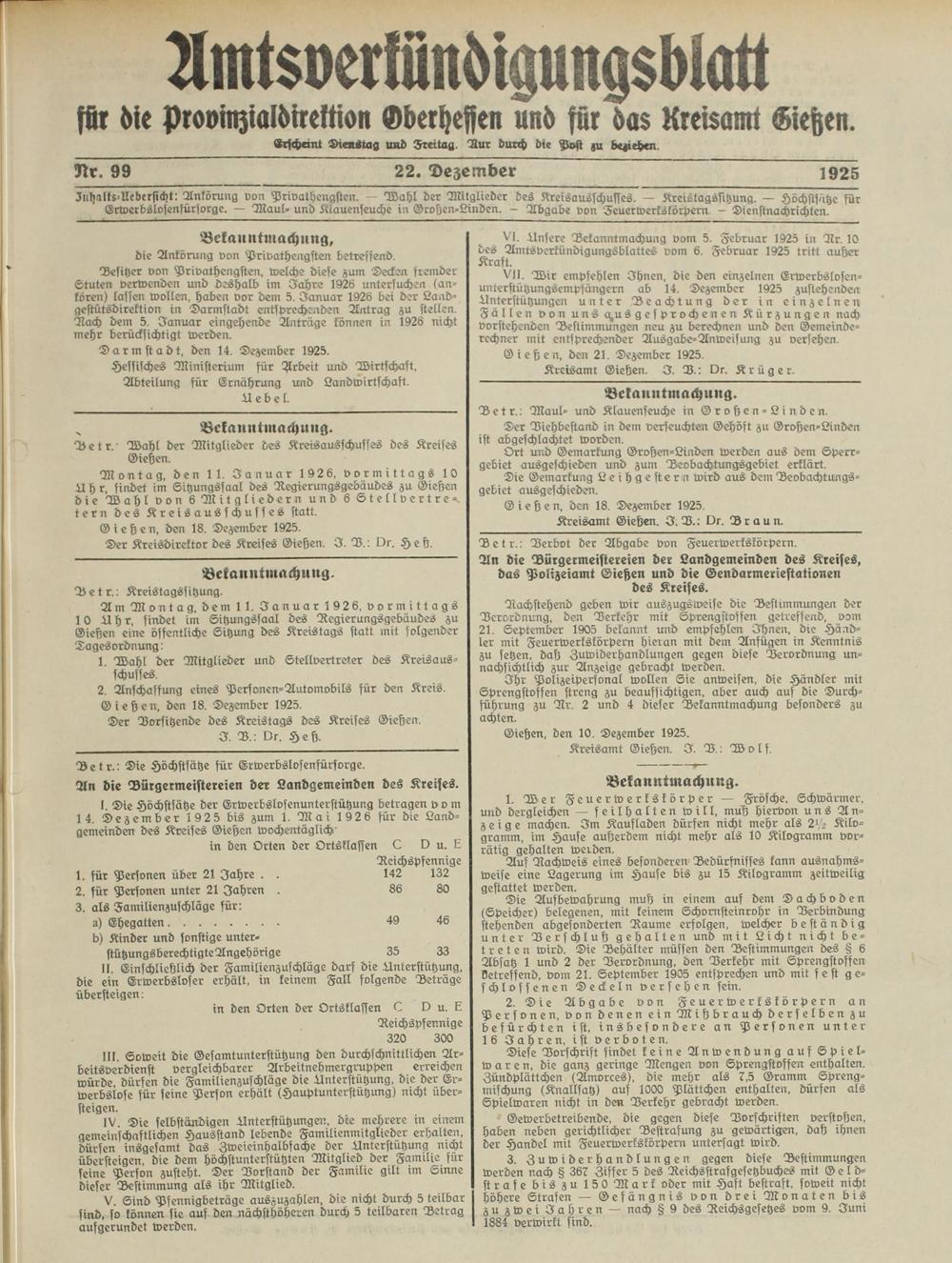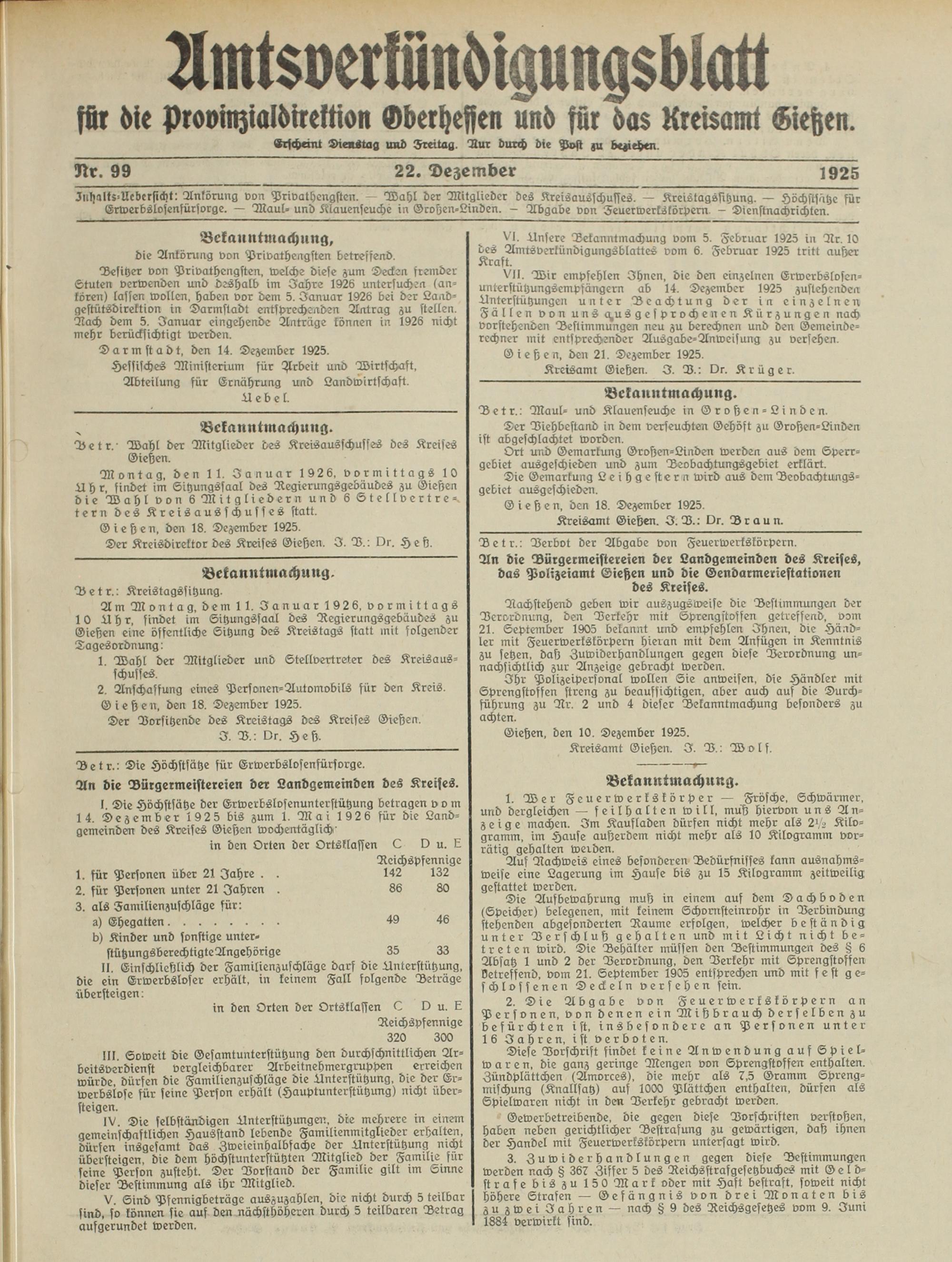 Itthalts-Uebersicht: Ankörung von Privathengsten. Wahl der Mitglieder des Kreisausschuffes. — Kreistagssihung. — Höchstsätze für Erwerbslosenfürsorge. — Maul- und Klauenseuche in Großen-Linden. - Abgabe von Feuerwerks körpern - Dienstnachrichten.