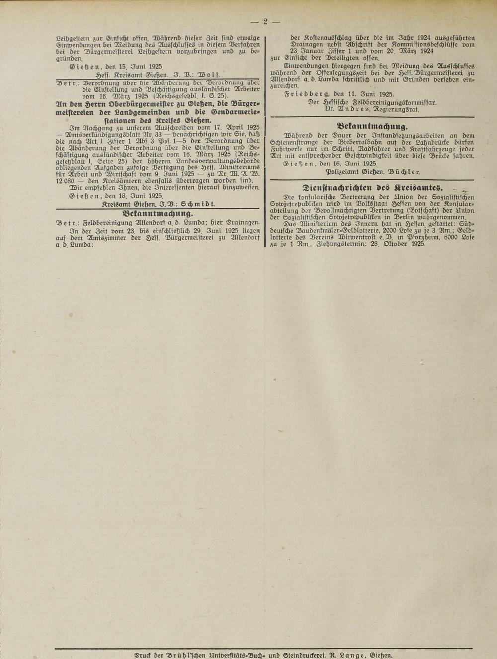 Im Aachgang zu unserem Ausschreiben vom 17. April 1925 — Amtsverkündigungsblatt Ar. 33 — benachrichtigen wir Sie, daß die nach Art. 1 Ziffer 1 Abs. 3 Pos. 1—5 der Verordnung über die Abänderung der Verordnung über die Einstellung und Beschäftigung ausländischer Arbeiter vom 16. März 1925 (Reichs- gesehblatt I. Seite 25) der höheren Landesverwaltungsbehörde obliegenden Aufgaben zufolge Verfügung des Hess. Ministeriums für Arbeit und Wirtschaft vom 9. Juni 1925 — zu Ar. M. A W. 12 080 — den Kreisämtern ebenfalls übertragen worden sind.