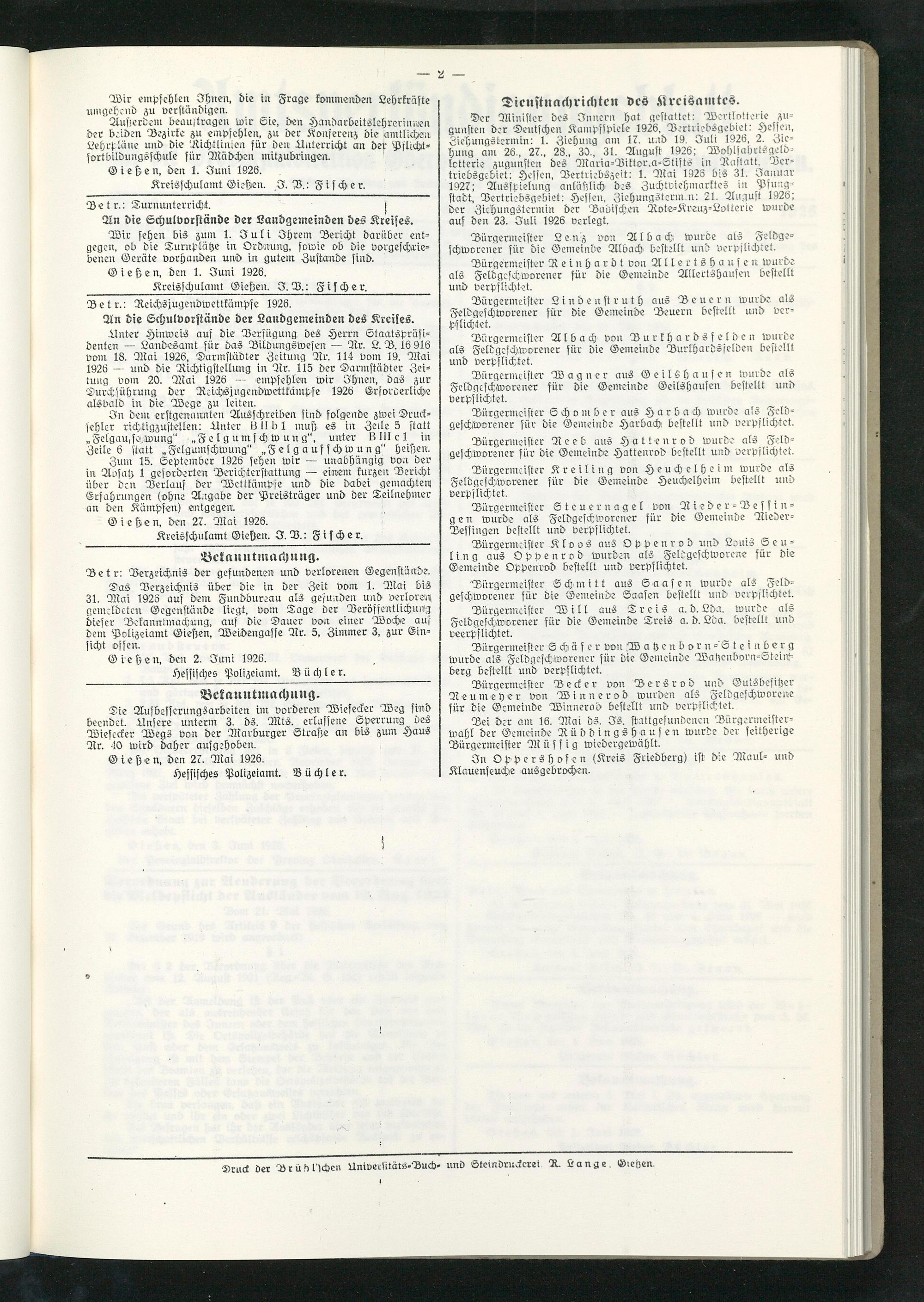 Das Verzeichnis über die in der Zeit vom 1. Mai bis 31. Mai 1926 auf dem Fundbureau als gefunden und verlorene gemeldeten Gegenstände liegt, vom Tage der Veröffentlichung dieser Bekanntmachung, auf die Dauer von einer Woche auf dem Polizeiamt Gießen, Weidengasse Ar. 5, Zimmer 3, zur Einsicht ossen.
