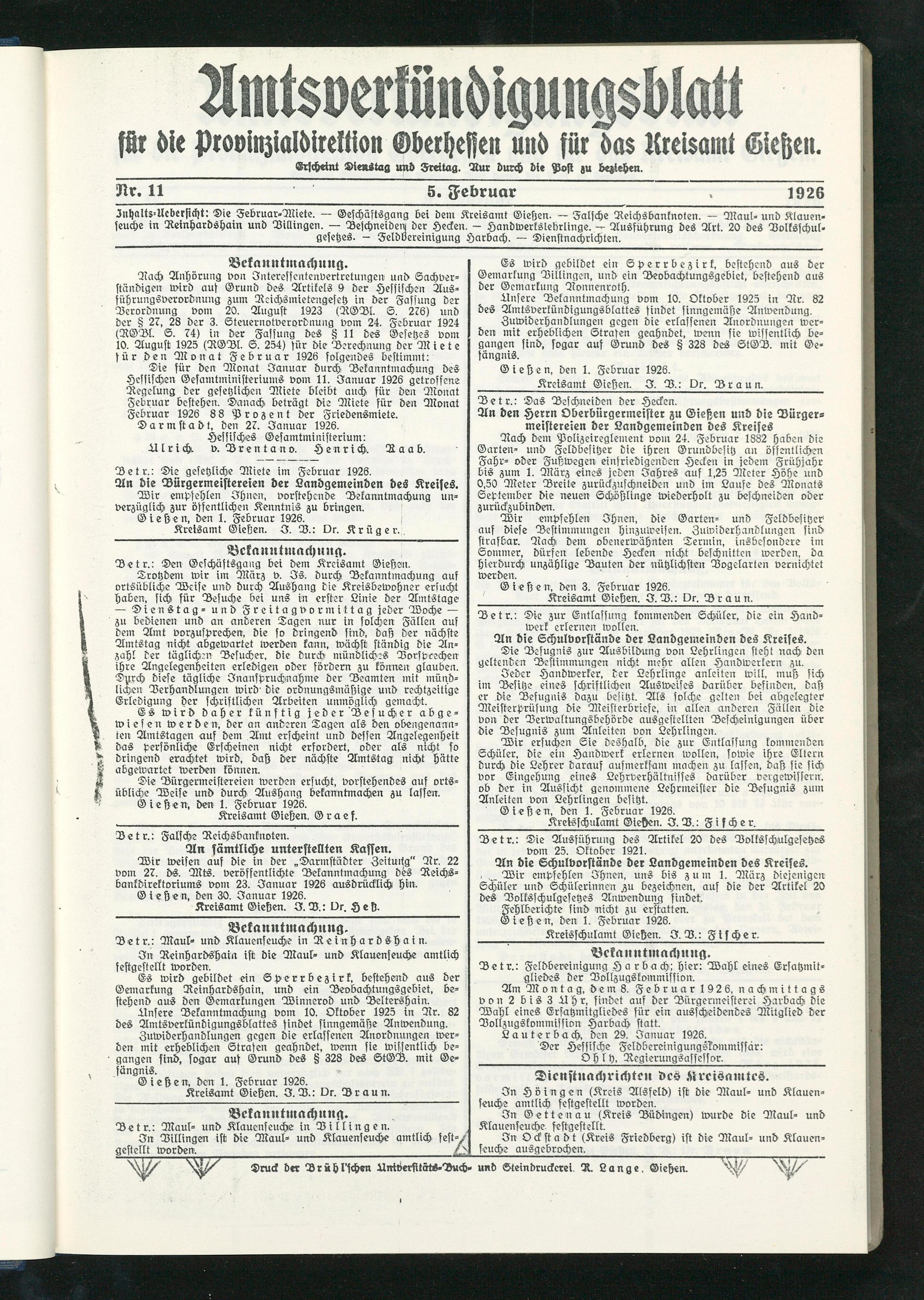 Inhalts-Ucbeksicht: Die Februar-Miete. — Geschäftsgang bei dem Kreisamt Gießen. — Falsche Reichsbanknoten. — Maul- und Klauen- seuche in Reinhardshain und Billingen. — Deschneideu der Hecken. - Handwerksiebrlinge. — Ausführung des Art. 20 des Dolksschul- gesehes. - Feldvereinigung Harbach. — Dienstnachrichten.