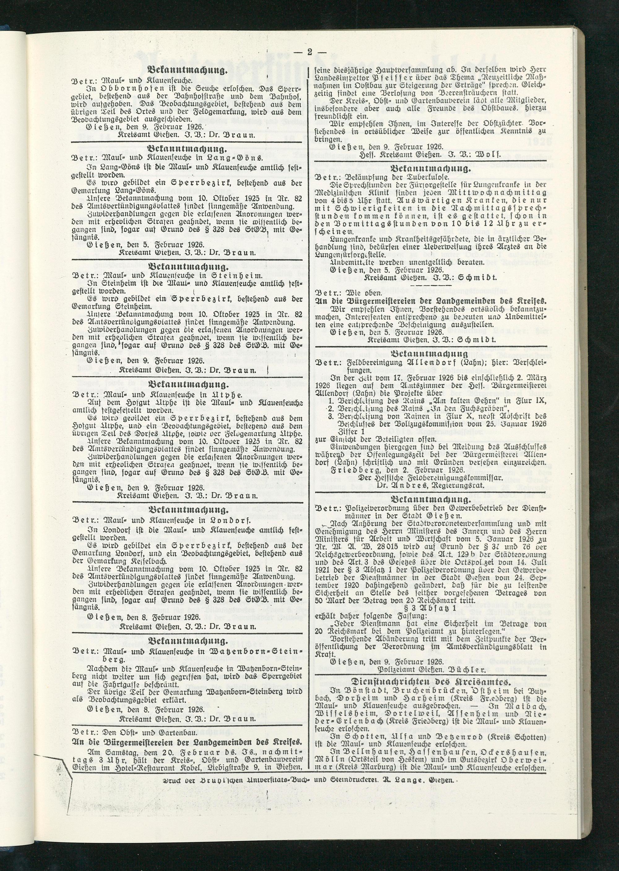 In B ö n st a d t, Bruchenbrücken, 'Ost heim bei Butzbach, Dorheim und Harheim (Kreis Fr.edberg) ist die Maul- und Klauenseuche ausgebrochen. — In M a i b a ch, Wisselsheim, Dortelweil, Assenheim und Dieder-Erlenbach (Kreis Friedberg) ist die Maul- und Klauenseuche erloschen.