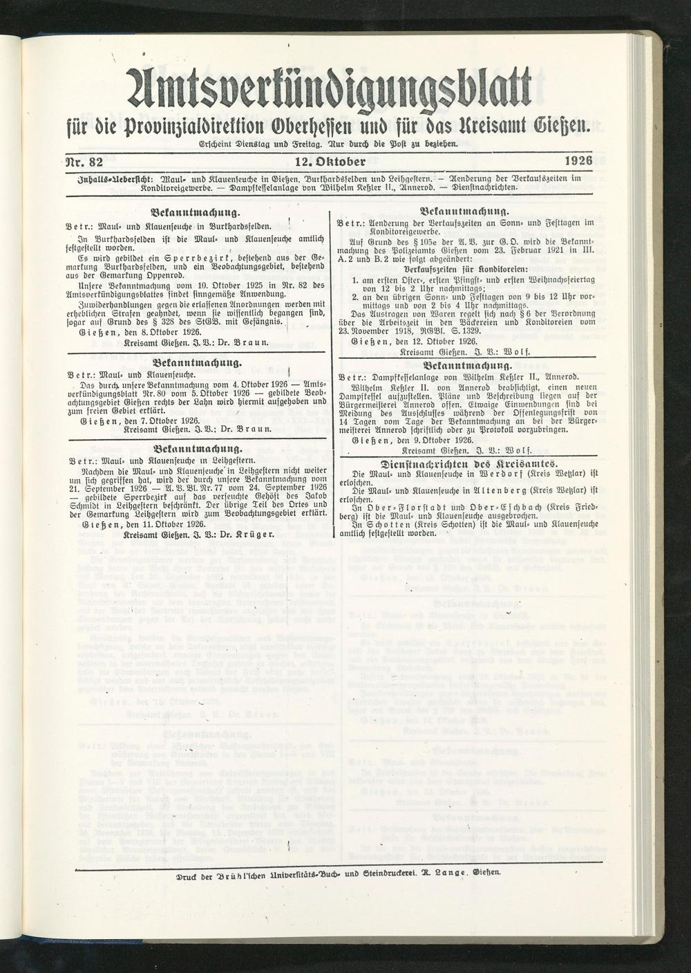 Znhalts-Aeberflcht: Maul» und Klauenseuche in Giehen. Burkhardsfelden und Leihgestern. - Aenderung der Verkaufszeiten im Konditoreigewerbe. — Dampfkeffelanlage von Wilhelm Kehler II., Annerod. — Dienstnachrichten.