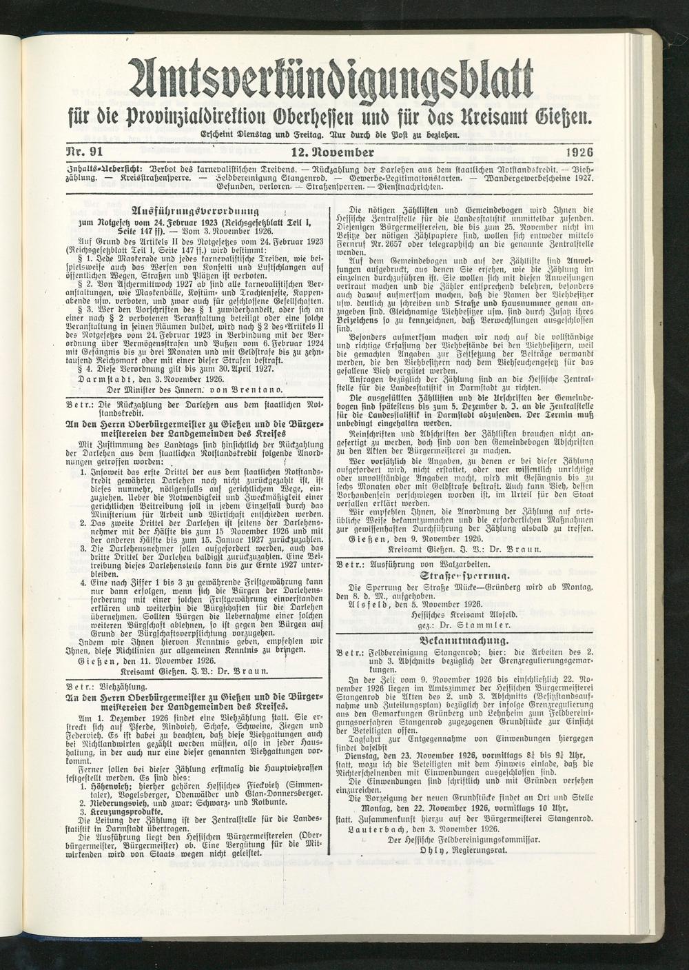Fnhalts-Aeberstcht: Verbot des karnevalistischen Treibens. — Rückzahlung der Darlehen aus dem staatlichen Rotstandskredit. — Viehzählung. — Kreisstrastensperre. — seldbereinigung Stangenrod. — Gewerbe-Legitimationstarten. — Wandergewerbescheine 1927. Gefunden, verloren. — Straßensperren. — Dienstnachrichten.