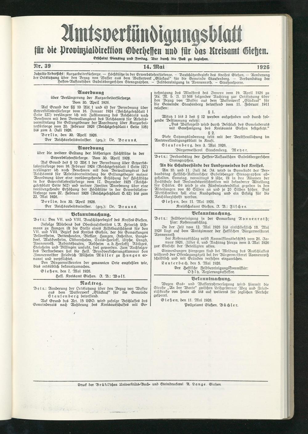 Jnlfaltsdlcberfidit' Kurzarbeiterfürsorge.— Höchstsätze in der Erwerbslosensürforge, - Bauschätzerbezirke des Kreises Giehen. — Aenderung bet Ortssatzung über ben Bezug von Wasser aus bem Wasserwerk „Glückauf" für die Gemeinde Staufenberg. — Derbandstag der Jessen-Rassauischen Gabelsbergerschen Stenographen. — Feldbereinigung in Ronnenroth. - Strassensperre.