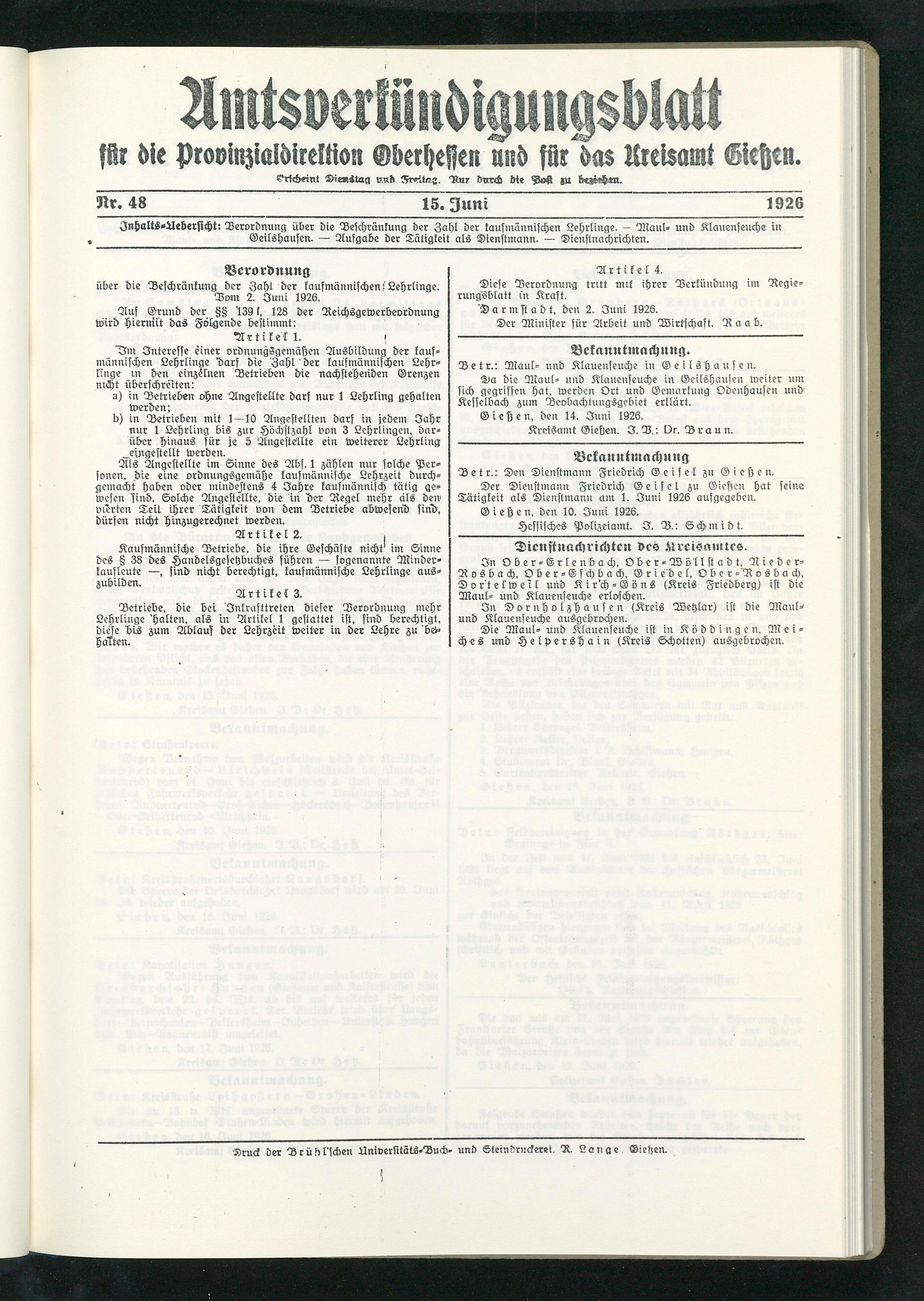 Inhalts-Aebersicht! Verordnung über die Beschränkung der Zahl der kaufmännischen Lehrlinge. — Maul- und Klauenseuche in Geilshausen. — Aufgabe der Tätigkeit als Dienstmann. — Dienstnachrichten.