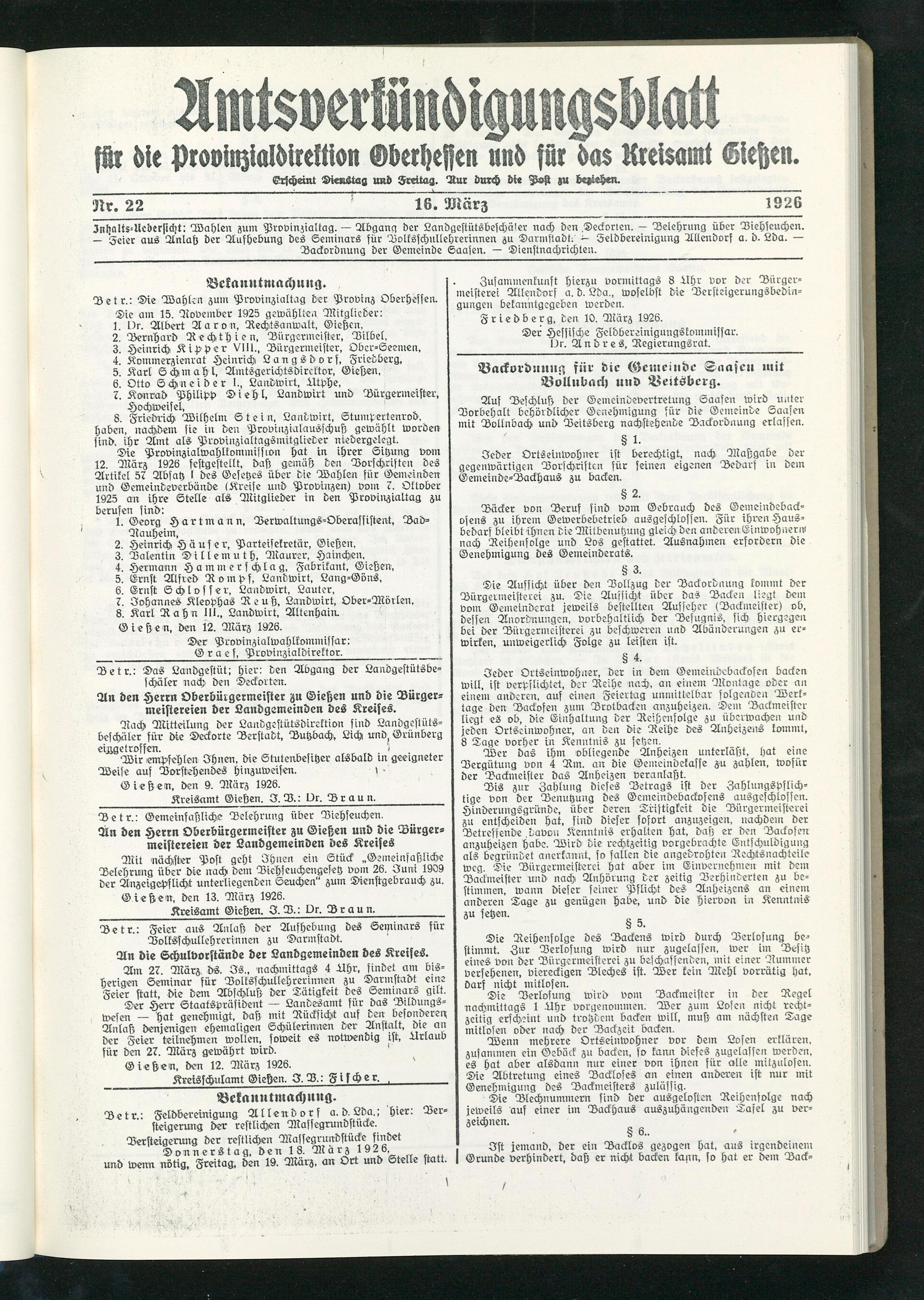 Znhaltr-Ucbersicht: Wahlen zum Prvvinzialtag. — Abgang der Lanügestütsbefchüler nach den.Deckorlen. — Belehrung über Viehseuchen. — Feier aus Anlaß der Aufhebung des Seminars für Volksschnllehrerinnen zu Darmstadt. — Teldbereinigung Allendorf a. d. Lda. — Backordnung der Gemeinde Saasen. — Dienstnachrichten.