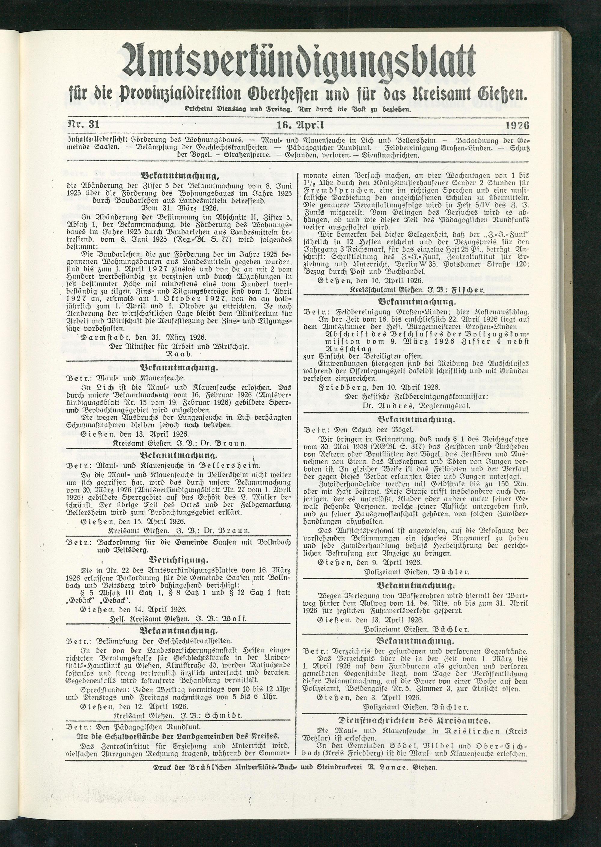 Dchaltr-lleberficht: Förderung des Wohnungsbaues. — Maul» und Klauenseuche in Lich und Bellersheim — Backordnung der Gemeinde Saasen. — Bekämpfung der Geschlechtskrankheiten. — Pädagogischer Rundfunk. — Feldbereinigung Großen-Linden. — Schutz der Dögel. - Straßensperre. — Gefunden, verloren. — Dienstnachrichten.