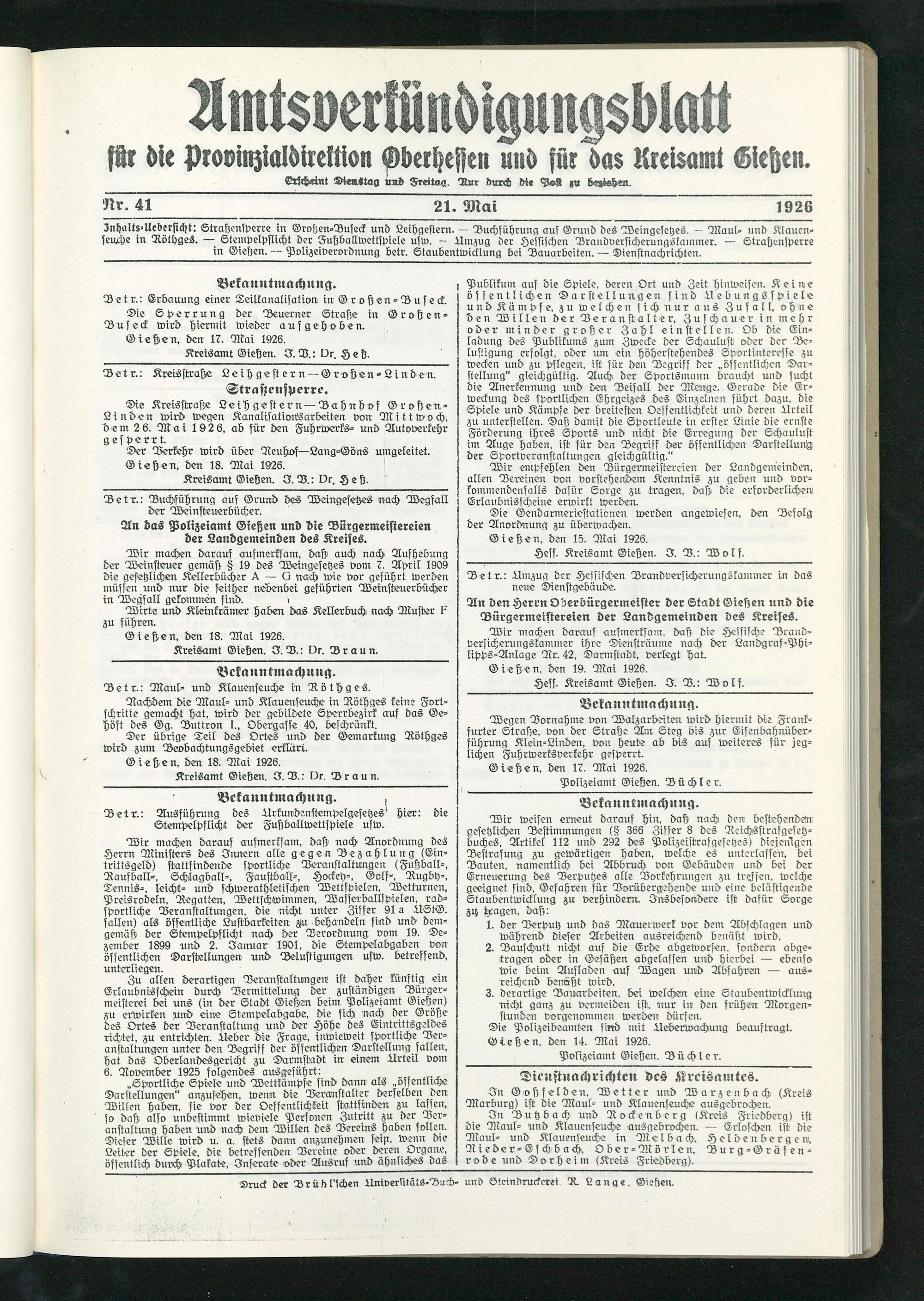 Znhaltr-Ucberficht: Straßensperre in Großen-Dufeck und Leihgestern. — Buchführung auf Grund des Weingesetzes. — Maui» und Klauenseuche in Röthges. —■ Stempelpflicht der Fußballwettspiele ufw. — Umzug der Hesflfchen Drandversicherungskainmer. — Straßensperre in Giesten. — Polizeiverordnung betr. Staubentwicklung bei Dauarbeiten. — Dienstnachrichten.