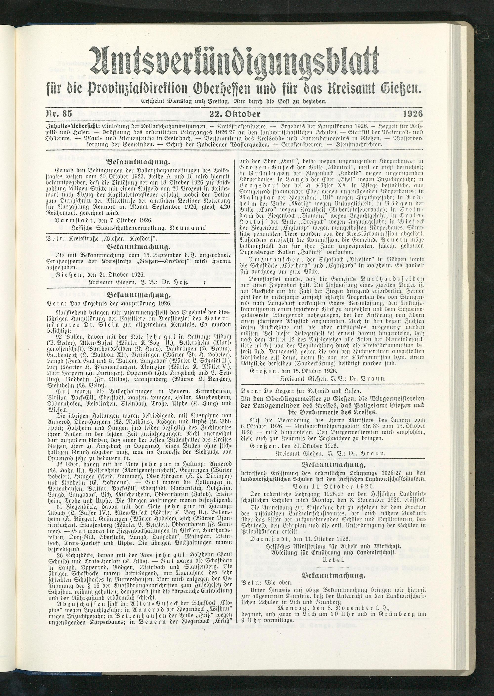 Fnhalts-Aebersicht: Einlösung der Dollarschatzanweisungen. - Kreisstratzeniperre. — Ergebnis der Hauplkörung 1926. - Hegzeit sür Rehwild und Hasen. — Eröffnung des ordenltichen Lehrganges 1926 2? an den landwirtschaftlichen Schuten. — Statistik der Weinmost- und Obsternte. — Maul- und Klauenseuche in Steinbach. — Versammlung des Kreisobst- und Gartenbauvereins in Giestcn. — Wasserversorgung der Gemeinden. — Schuh der Jnheidener Wasserguellen. — Straßensperren. — Dienstnachrichten.